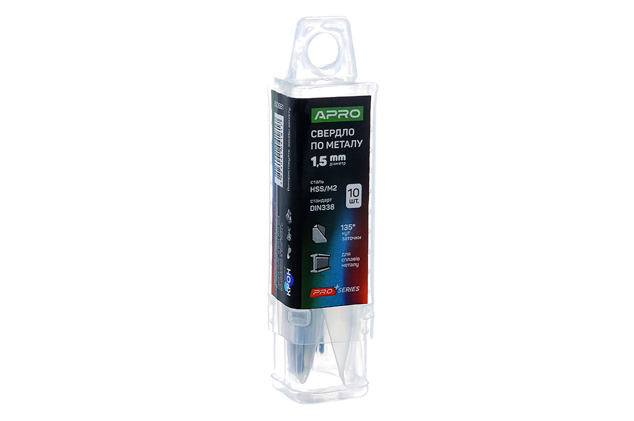Свердло по металу Apro - призначене для свердління отворів у металевих матеріалах, включаючи сталь, чавун, алюміній та інші сплави. Діаметр 1,5 мм; Швидкорізальна сталь марки М2.