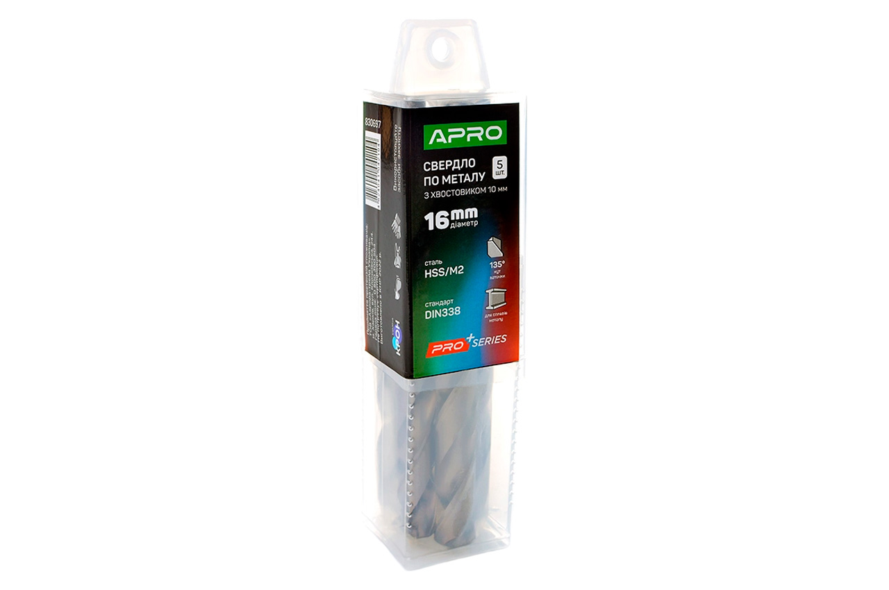 Свердло по металу Apro - призначене для свердління отворів у металевих матеріалах, включаючи сталь, чавун, алюміній та інші сплави. Діаметр 16,0 мм; Швидкорізальна сталь марки М2.