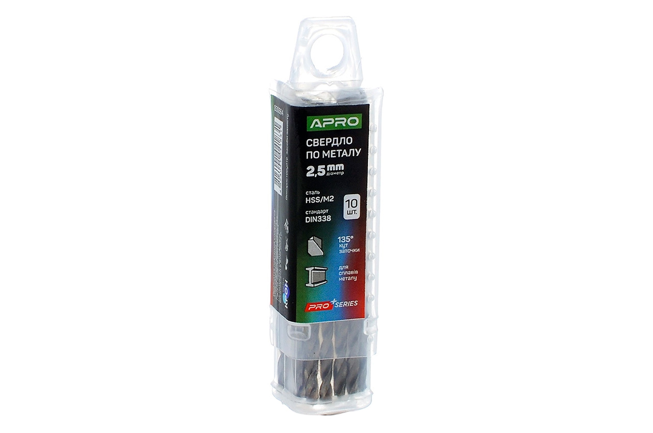 Свердло по металу Apro - призначене для свердління отворів у металевих матеріалах, включаючи сталь, чавун, алюміній та інші сплави. Діаметр 2,5 мм; Швидкорізальна сталь марки М2.