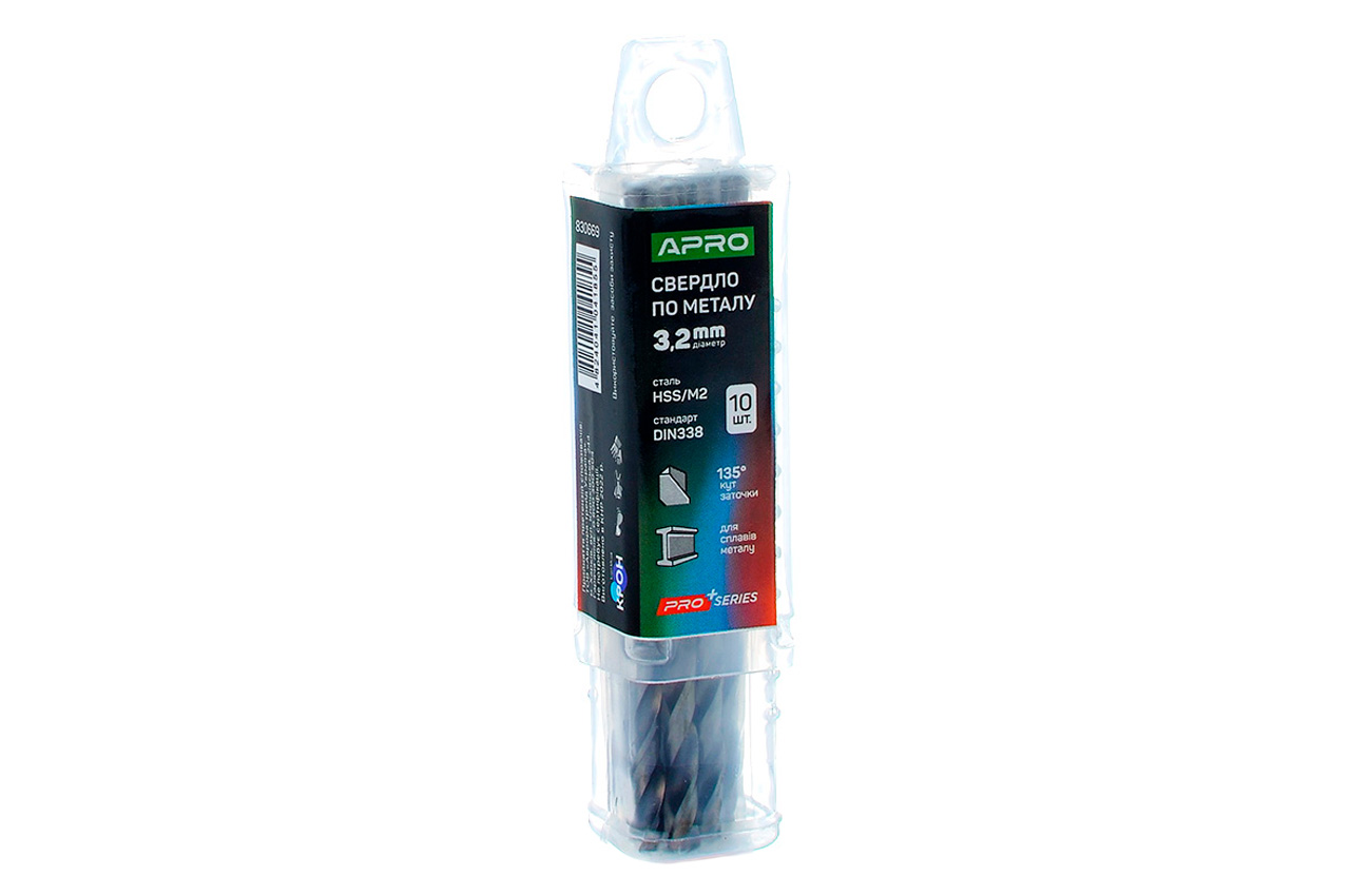Свердло по металу Apro - призначене для свердління отворів у металевих матеріалах, включаючи сталь, чавун, алюміній та інші сплави. Діаметр 3,2 мм; Швидкорізальна сталь марки М2.
