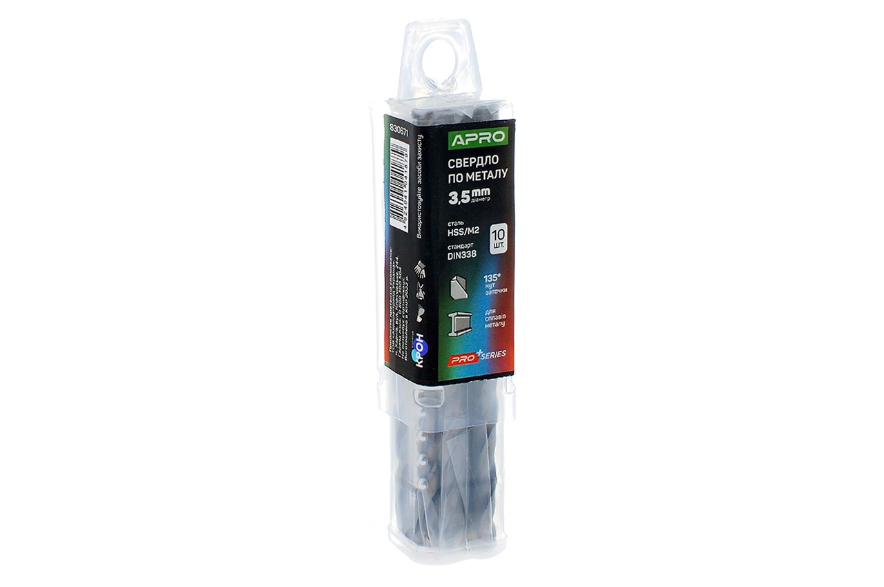 Свердло по металу Apro - призначене для свердління отворів у металевих матеріалах, включаючи сталь, чавун, алюміній та інші сплави. Діаметр 3,5 мм; Швидкорізальна сталь марки М2.