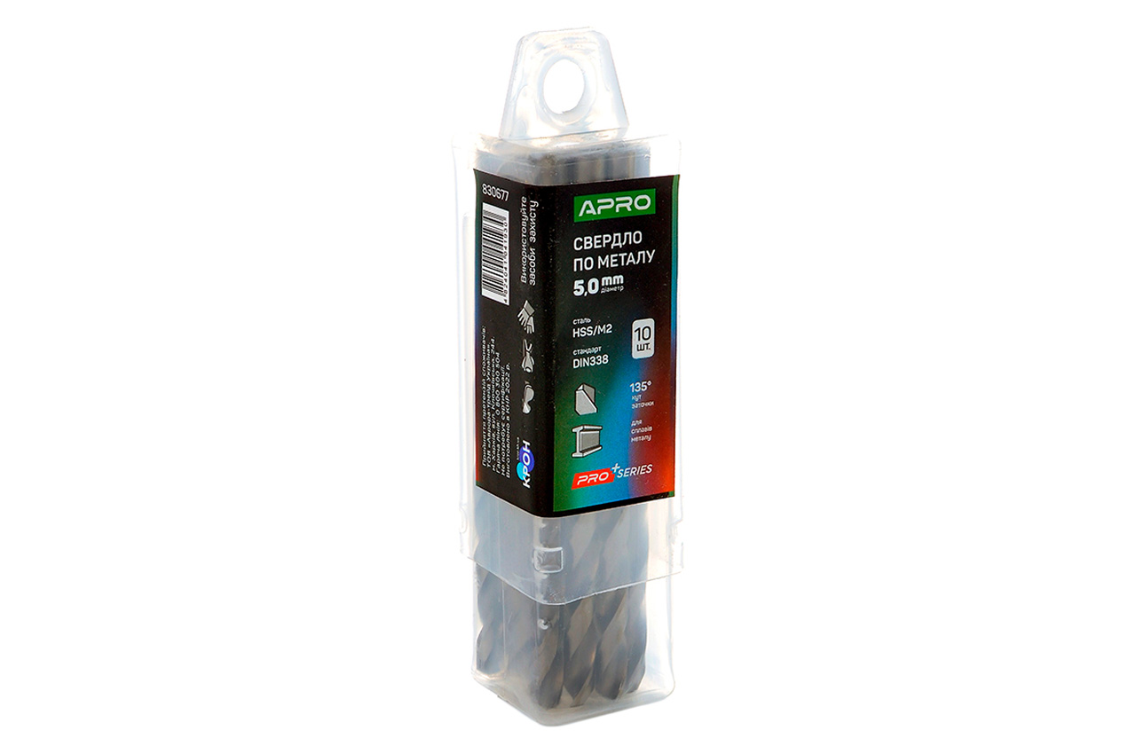 Свердло по металу Apro - призначене для свердління отворів у металевих матеріалах, включаючи сталь, чавун, алюміній та інші сплави. Діаметр 5,0 мм; Швидкорізальна сталь марки М2.