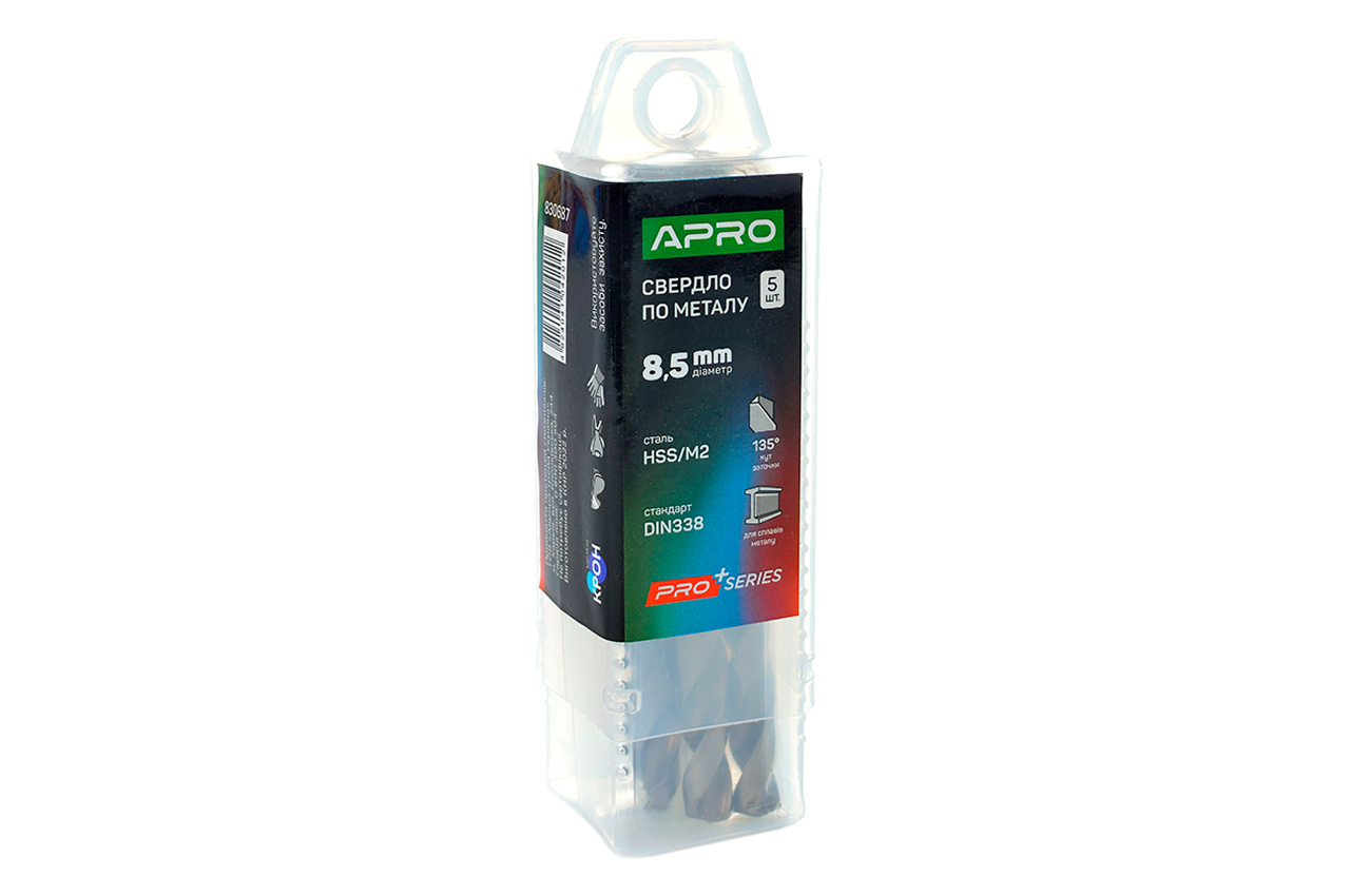 Свердло по металу Apro - призначене для свердління отворів у металевих матеріалах, включаючи сталь, чавун, алюміній та інші сплави. Діаметр 8,5 мм; Швидкорізальна сталь марки М2.