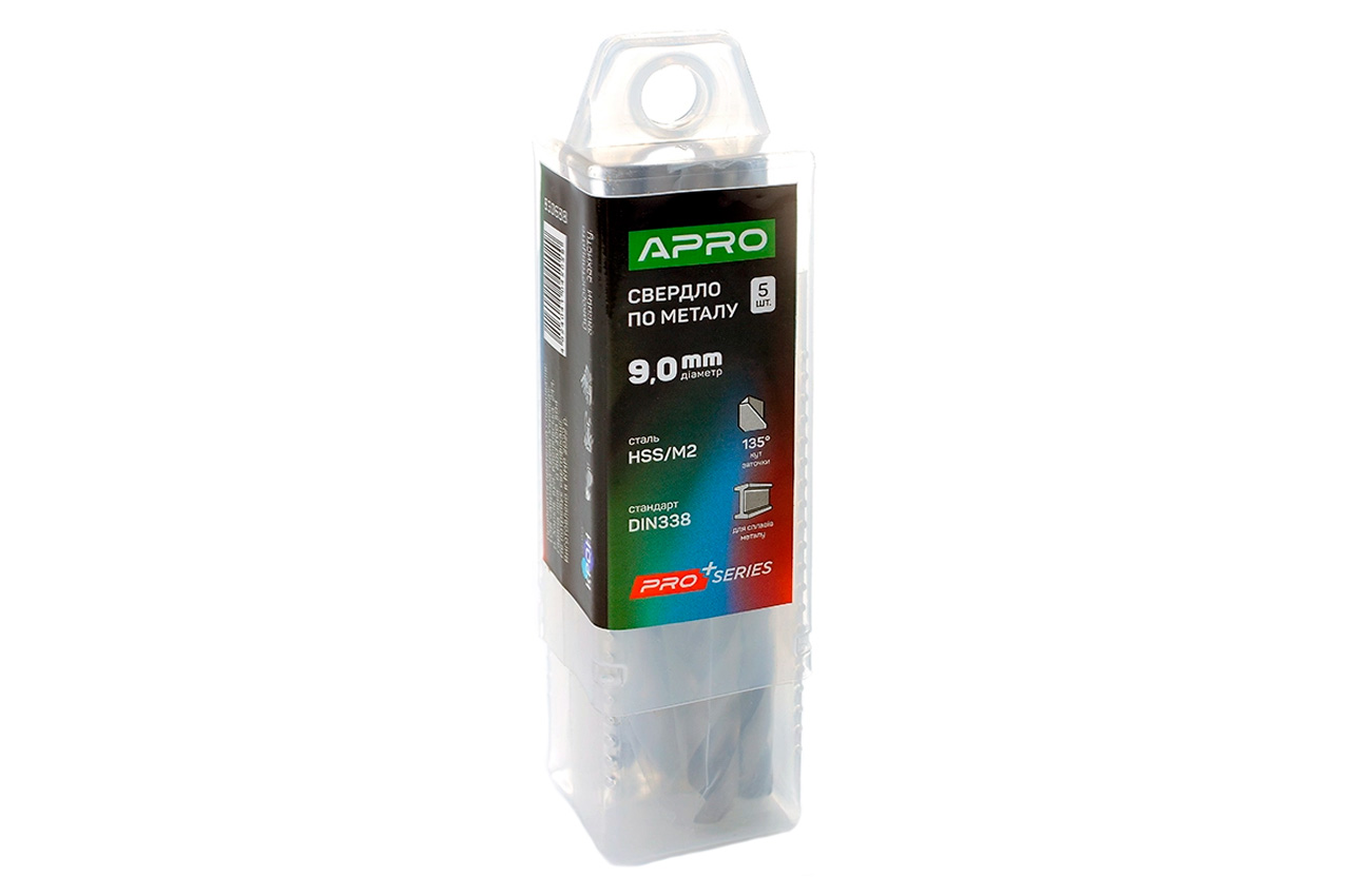 Свердло по металу Apro - призначене для свердління отворів у металевих матеріалах, включаючи сталь, чавун, алюміній та інші сплави. Діаметр 9,0 мм; Швидкорізальна сталь марки М2.