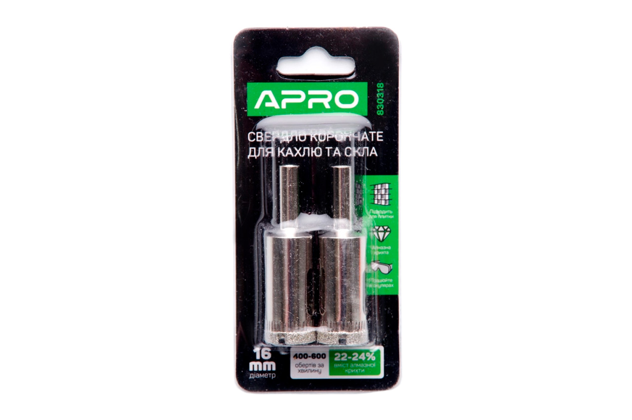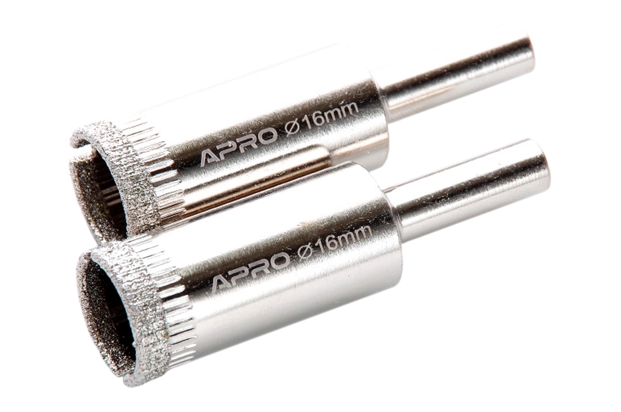 Свердло по склу та кераміці трубчасте Apro застосовуються для свердління отворів в оптичному та технічному склі, керамічної плитки, мармуру, кахлю. Діаметр свердла 16 мм