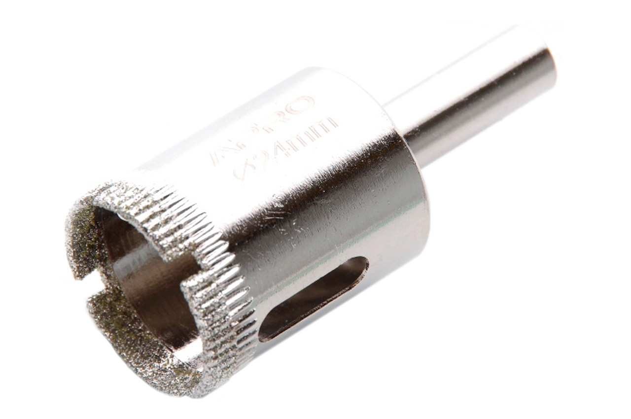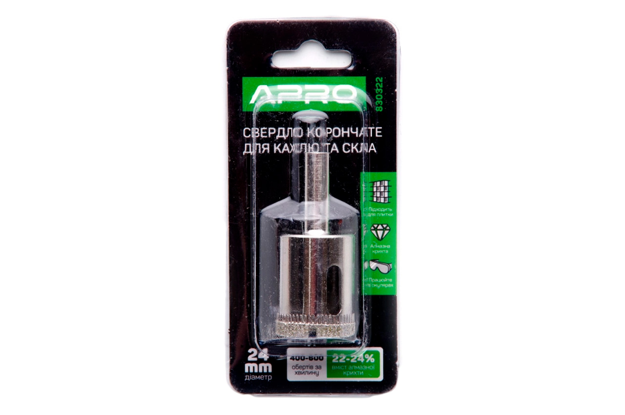 Свердло по склу та кераміці трубчасте Apro застосовуються для свердління отворів в оптичному та технічному склі, керамічної плитки, мармуру, кахлю. Діаметр свердла 24 мм