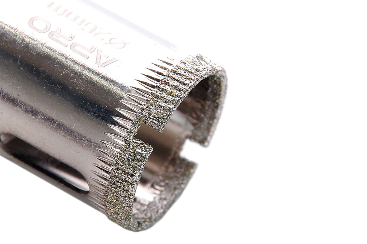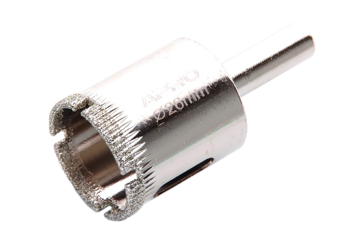 Свердло по склу та кераміці трубчасте Apro застосовуються для свердління отворів в оптичному та технічному склі, керамічної плитки, мармуру, кахлю. Діаметр свердла 26 мм