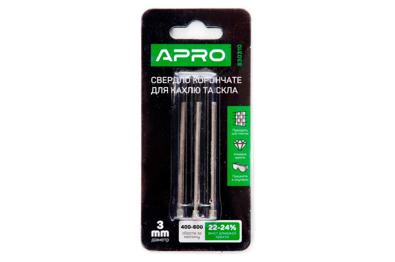 Свердло по склу та кераміці трубчасте Apro застосовуються для свердління отворів в оптичному та технічному склі, керамічної плитки, мармуру, кахлю. Діаметр свердла 3 мм