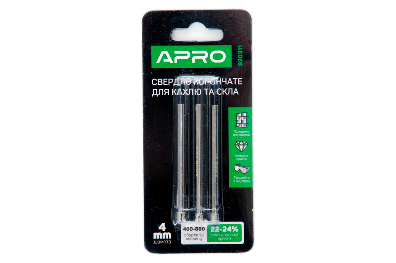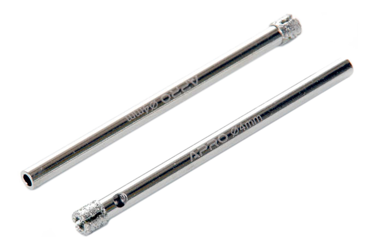 Свердло по склу та кераміці трубчасте Apro застосовуються для свердління отворів в оптичному та технічному склі, керамічної плитки, мармуру, кахлю. Діаметр свердла 4 мм