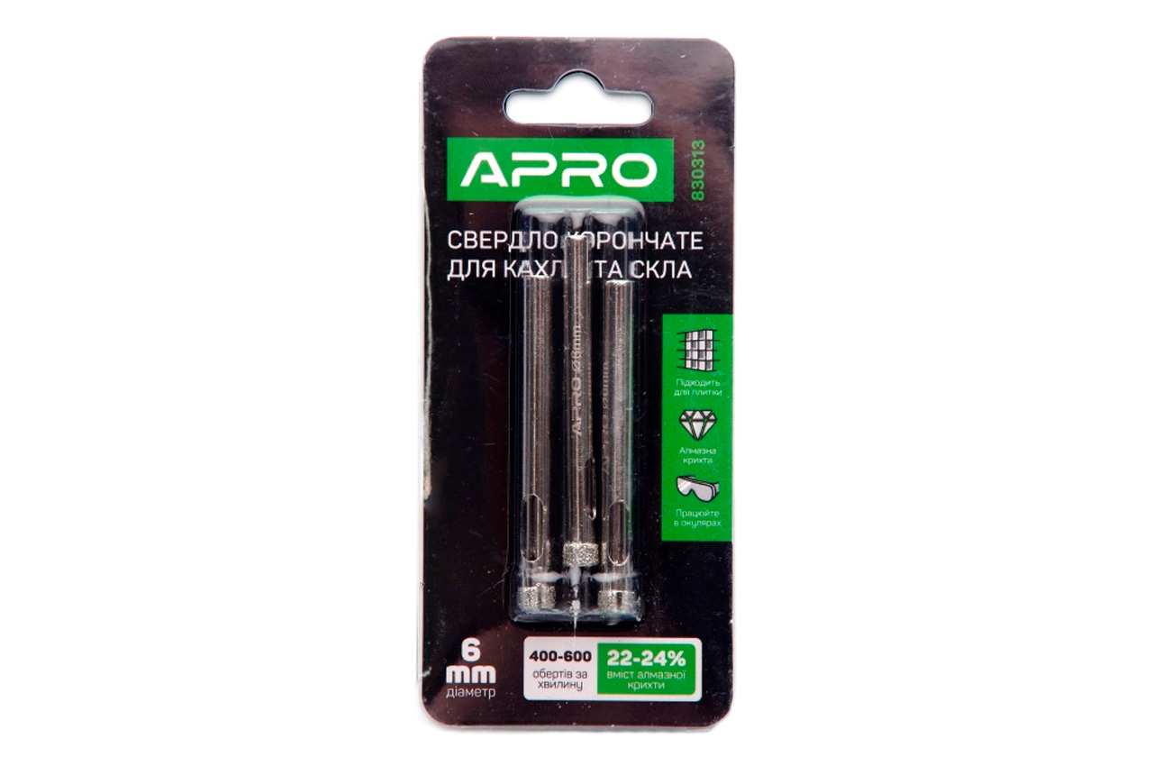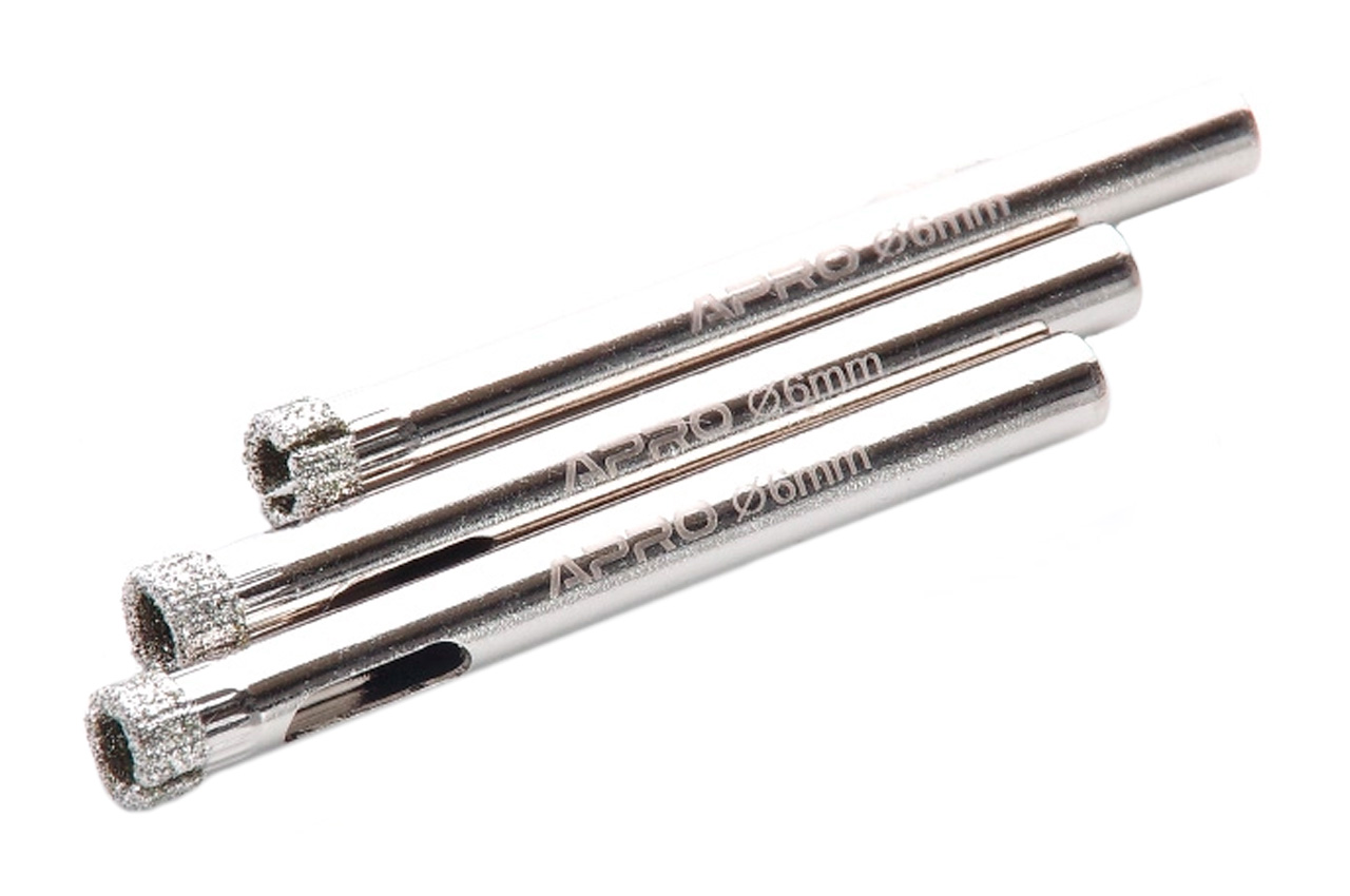 Свердло по склу та кераміці трубчасте Apro застосовуються для свердління отворів в оптичному та технічному склі, керамічної плитки, мармуру, кахлю. Діаметр свердла 6 мм