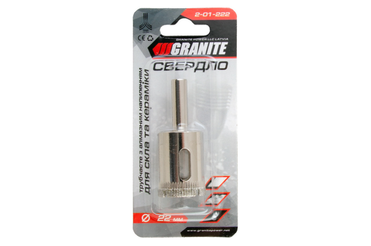 Свердло трубчасте по склу та плитці Granite 22 мм свердло Granite трубчасте з алмазним напиленням для скла та плитки. Застосовувати тільки в неударном режимі, охолоджувати водою.