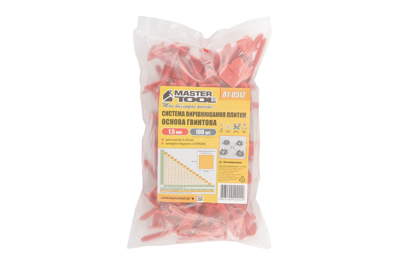 Система вирівнювання плитки гвинтова Mastertool - це матеріал для одноразового використання, що встановлюється між плитками під час їх укладання. Товщина основи 1,5 мм дозволяє створювати ідеальні міжплиткові шви відповідної ширини. Багаторазовий елемент гвинтової системи. Гайки вручну накручуються на основу, вирівнюючи площину плиток при затягуванні. Виготовлені з пластику, тому ймовірність пошкодження поверхні повністю виключена. Поставляються упаковкою 100 шт.