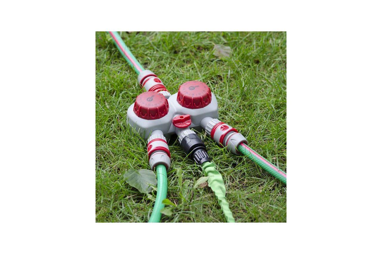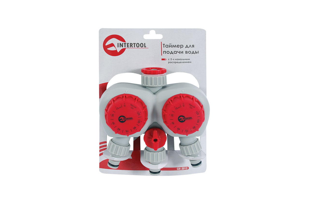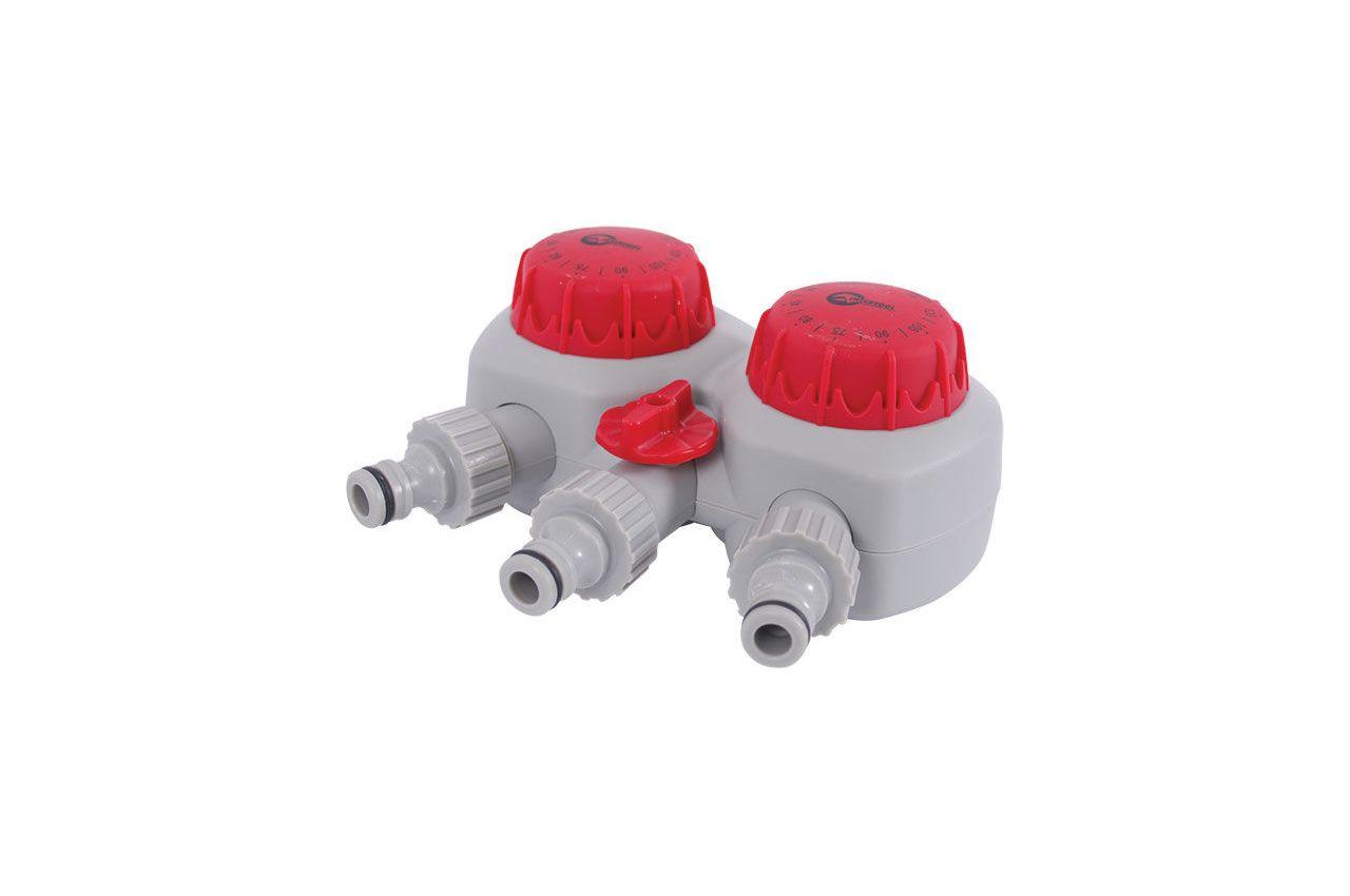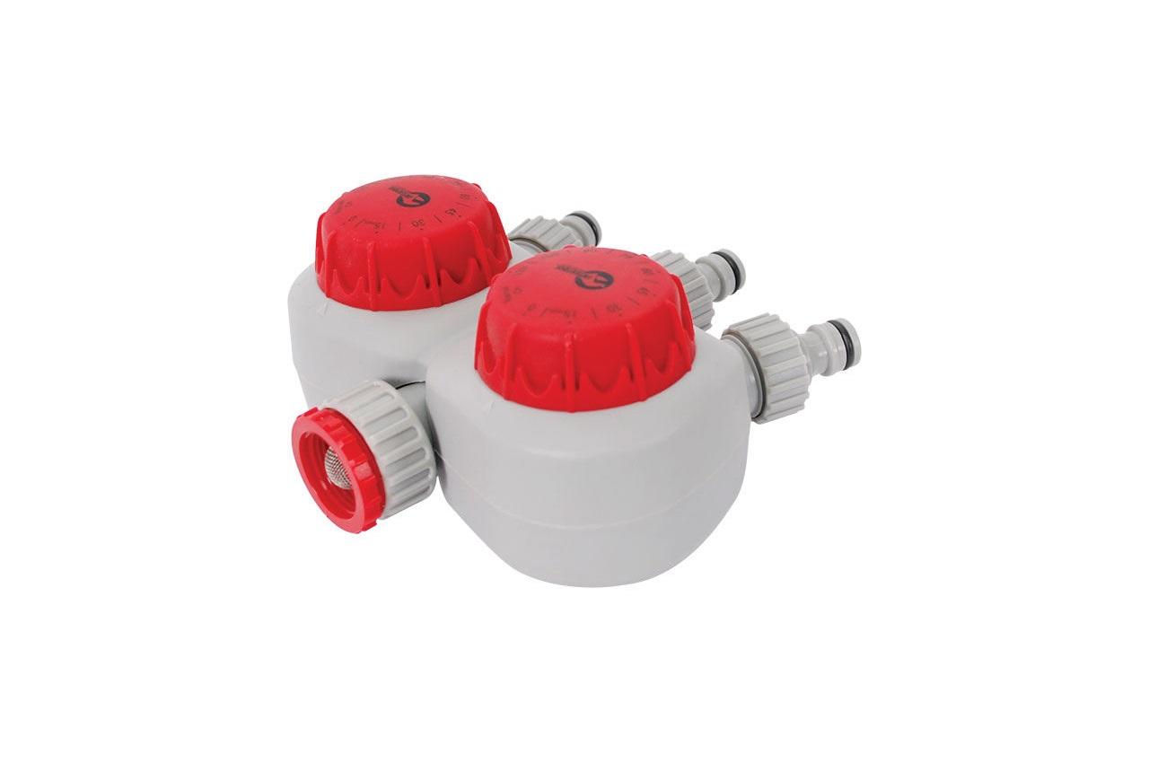 Таймер для подачі води з двоканальним розподілом і трьома виходами на коннектор 1/2 ". Він дозволяє розгалужувати потік на три канали, автоматично регулювати час припинення подачі води на два канали з можливістю установки тривалості поливу від 15 до 120 хв з кроком в 15 хв і регулюванням потужності подачі води на третій канал, або повного припинення подачі. Для роботи таймера батареї не потрібні. Різьба зовнішня: 1/2 "; Різьба внутрішня: 3/4 "; Комплектація: таймер для подачі води, фільтр-сітка 3/4", 3 адаптера 1/2 "з внутрішнім різьбленням