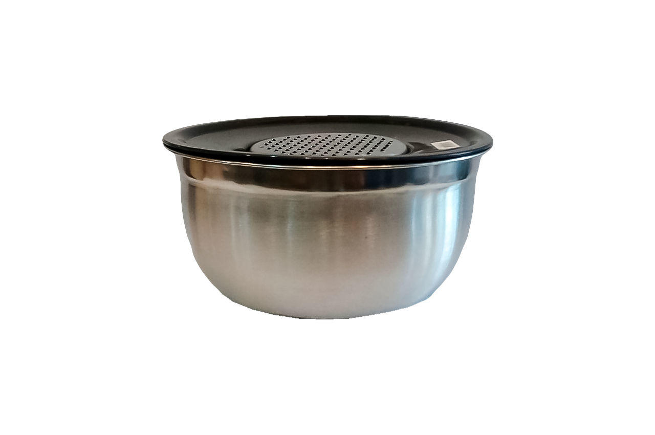 Миска з нержавіючої сталі для приготування та подачі їжі. Функціональна кришка зі змінними тертками дозволяє натерти продукти безпосередньо в миску. Три терки: для дрібного або більш товстого натирання, для нарізки скибочками. Отвір в кришці дозволяє використовувати блендер або міксер без розплескування вмісту. Антиковзаюче покриття підстави миски.