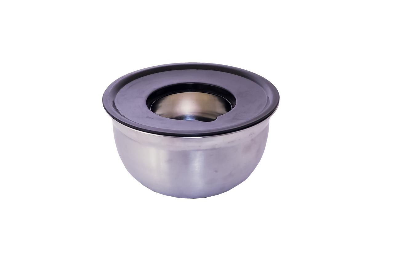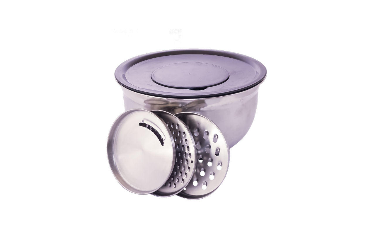 Бренд: Empire. Матеріал: Високоякісна харчова нержавіюча сталь. Діаметр верхньої частини: 240 мм. Матеріал нижньої частини: Гума. Колір нижньої частини: Чорний, зелений. Діаметр нижньої частини: 110 мм. Діаметр кришці: 240 мм. Колір кришки: Чорний, зелений. Діамерт внутрішній частині кришки. 120 мм. Діаметр насадок: 120 мм (3 шт). Обсяг: 4000 мл. Висота: 135 мм. Форма: Кругла. Колір: Сталевий.