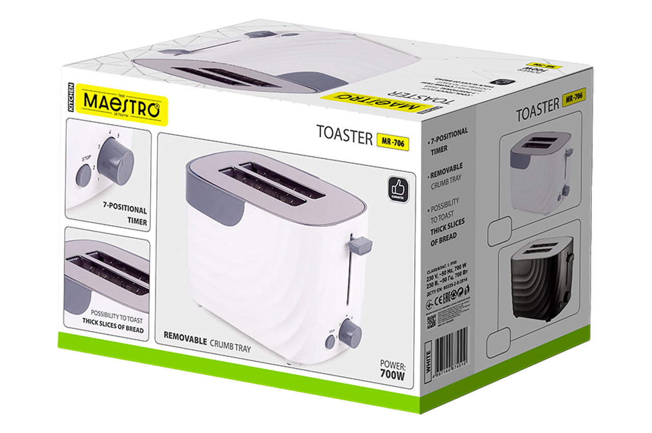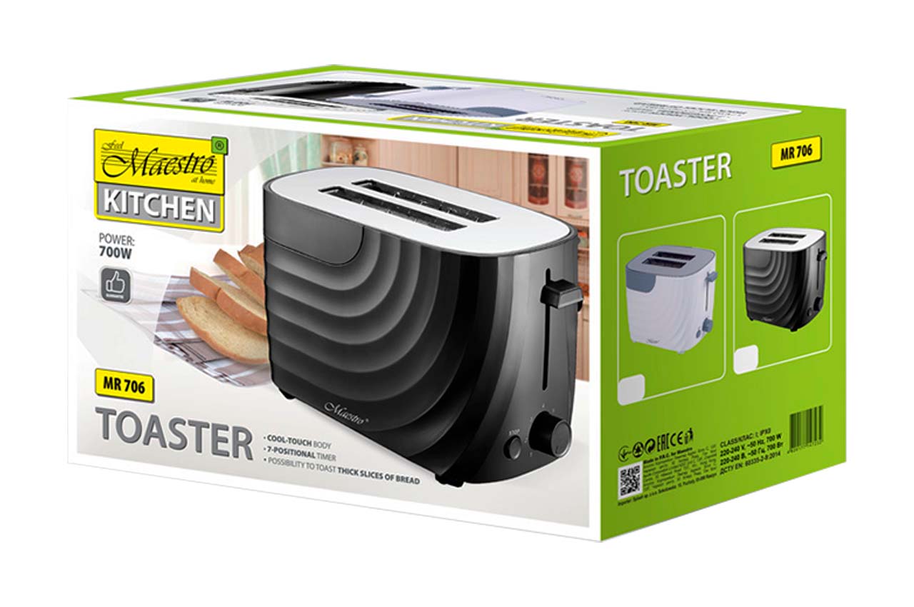 Тостер Maestro MR 706 потужністю 700 Вт має 7 режимів прожарювання, випускається у зручному пластиковому корпусі білого або чорного кольору. У торці корпусу розташовані ручки вибору режимів та кнопка "скасування". Тостер призначений для підсмаження шматочків хліба з можливістю утворення хрусткої скоринки.