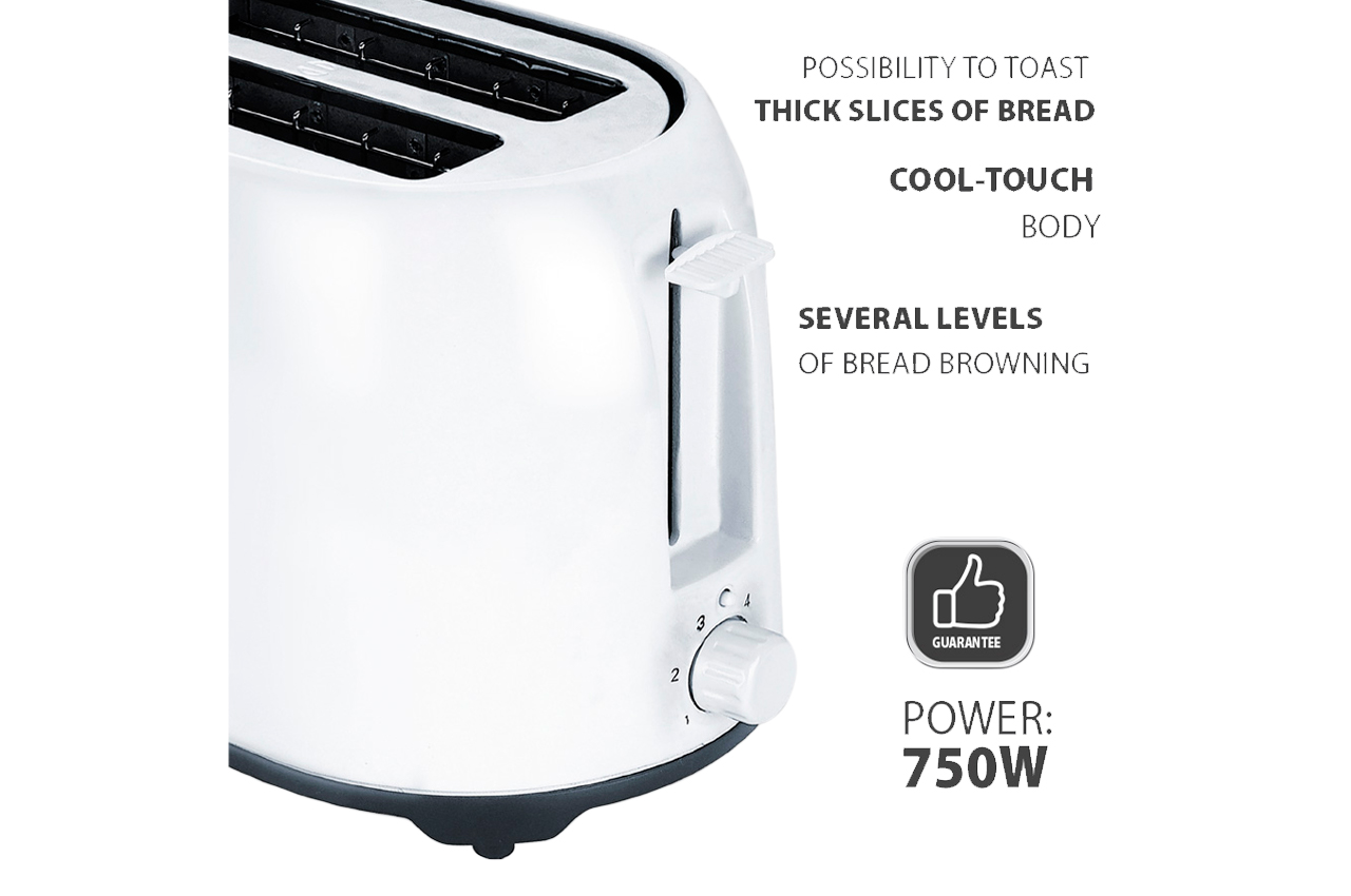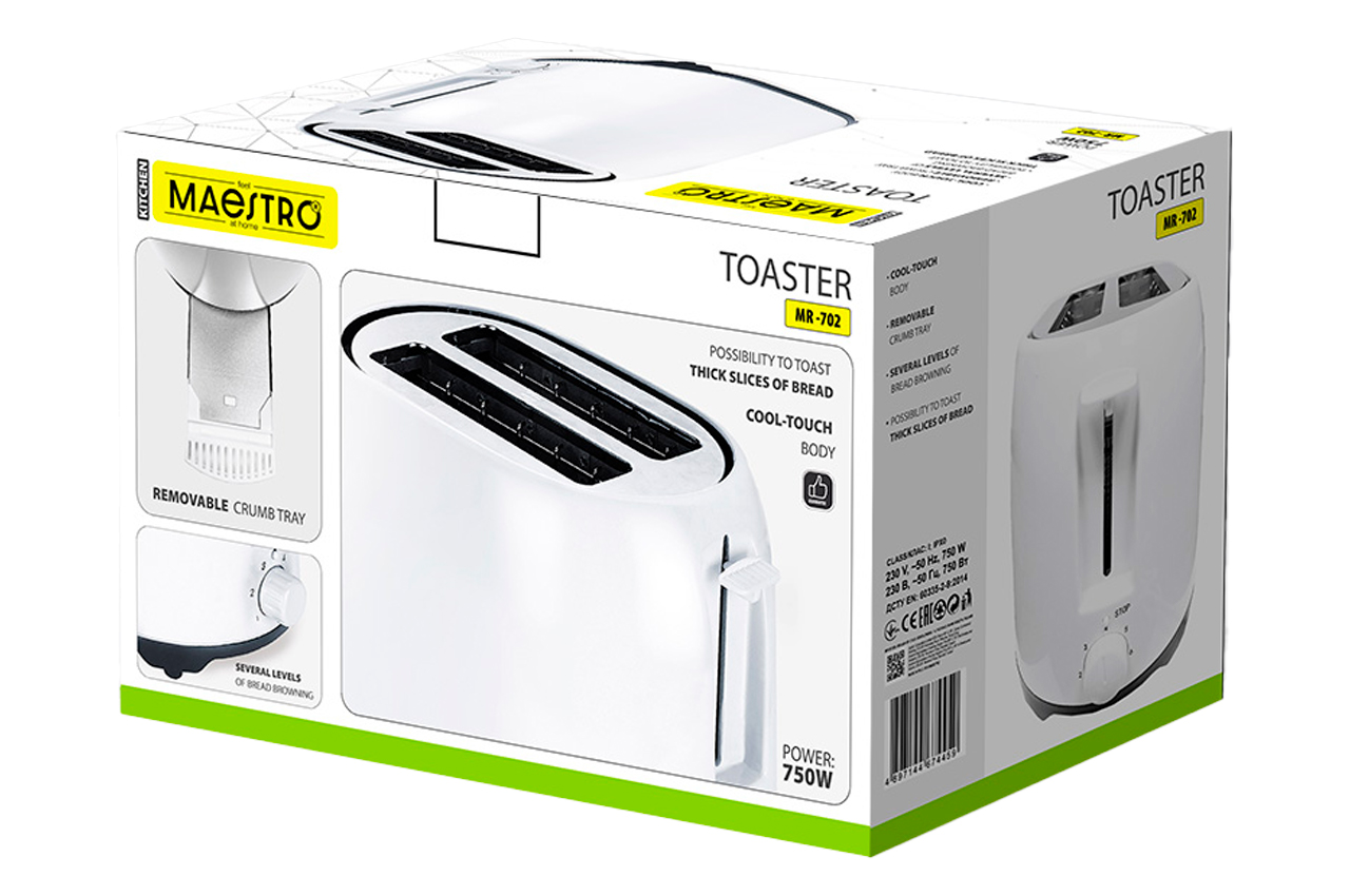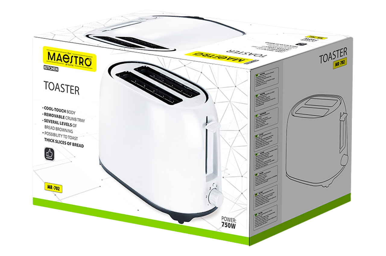 Тостер Maestro MR-702 представлений у вигляді компактного, зручного та стильного кухонного приладу для підсмажування шматочків хліба одночасно з двох боків. Потужність приладу 750 Вт дозволяє засмажувати шматочки хліба за короткий проміжок часу. Щоб хліб не підгорів, в конструкції тостера передбачений регулятор, за допомогою якого кожен член сім'ї зможе індивідуально контролювати ступінь підсмажування. Корпус тостера виготовлений із пластику білого кольору. Вертикальне завантаження хліба полегшує процес використання приладу. Після приготування є автоматична функція відключення, що унеможливлює візуального контролю. У нижній частині є люк, з якого можна очищати прилад від крихт.