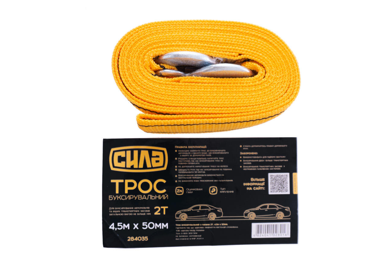 Трос буксирувальний Сила - використовується для буксирування транспортних засобів. Максимальне навантаження 2 т; Довжина 4,5 м; Ширина 50 мм. Матеріал полипропилен.