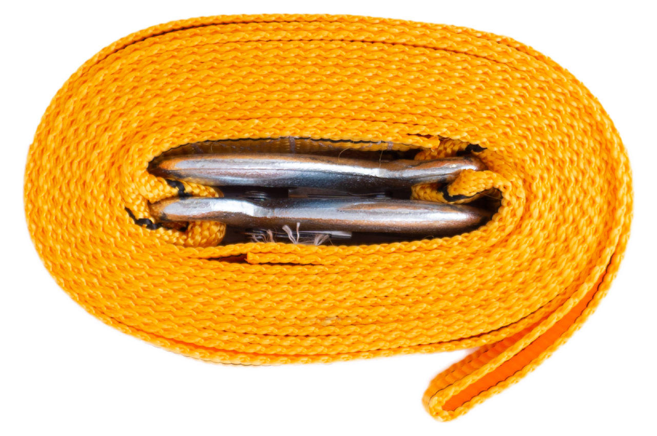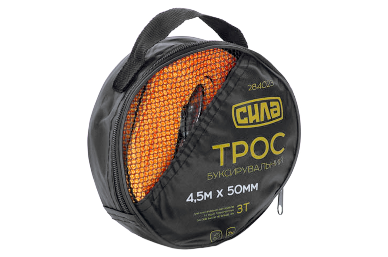 Трос буксирувальний Сила - використовується для буксирування транспортних засобів. Максимальне навантаження 3 т; Довжина 4,5 м; Ширина 50 мм. Матеріал полипропилен.