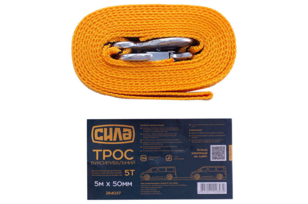 Трос буксирувальний Сила - використовується для буксирування транспортних засобів. Максимальне навантаження 5 т; Довжина 5 м; Ширина 50 мм. Матеріал полипропилен.