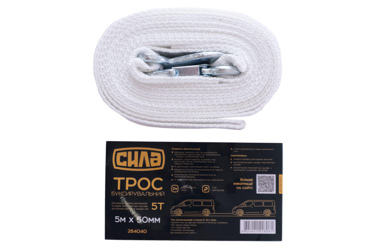 Трос буксирувальний Сила - використовується для буксирування транспортних засобів. Максимальне навантаження 5 т; Довжина 5 м; Ширина 50 мм. Матеріал полипропилен.