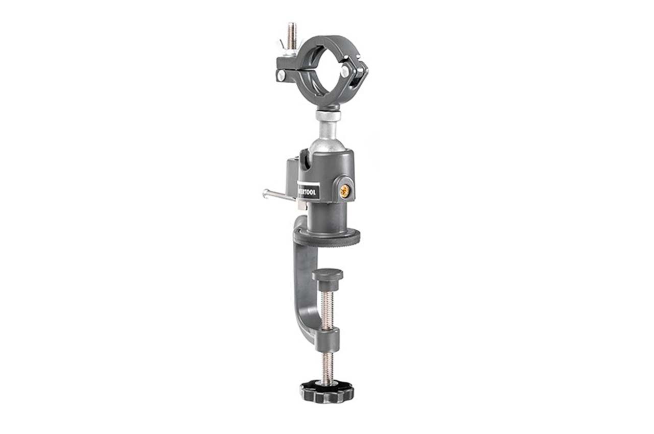 Тримач для дриля HT-0091 - це простий та надійний пристрій, настільки зручний, що будь-якому майстру знадобиться у своєму арсеналі інструменту. Використовується для утримання дриля, фрезерувальних та шліфувальних машин (з діаметром шийки 43 мм), у потрібному горизонтальному положенні, що розширює можливості вашого інструменту. Тримач дозволяє повертати інструмент під будь-яким кутом як у горизонтальній, і у вертикальній площині на 360°, завдяки наявності шарніра, який фіксується у необхідному положенні. Це дозволяє виконати будь-які стаціонарні роботи, наприклад робити дуже точні отвори у великих кількостях, шліфувати, пиляти рейки і т.п. Тримач дуже легко монтується на будь-яку поверхню, розмір посадкового отвору для столу 50 мм. Пристрій виконаний з високоякісного алюмінієвого сплаву, що забезпечує стійкість до появи корозії та необхідну міцність. Кріпильний гвинт із металу з упором під фіксацію до поверхні. Наявність гумової накладки до стільниці забезпечує збереження робочого столу.