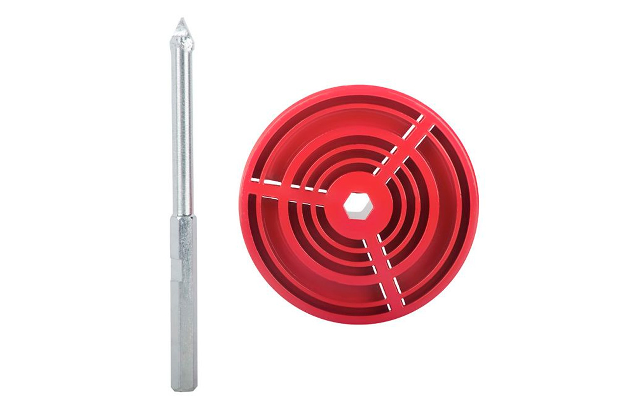 Універсальний тримач для кільцевих коронок різного діаметру (33, 43, 53, 63, 67, 73, 83 мм), поставляється в комплекті з центрирующим свердлом. Шестигранний хвостовик направляючого свердла підходить під патрон будь дрилі. Максимальні обороти електроінструменту для роботи з тримачем - 1500 об / хв.