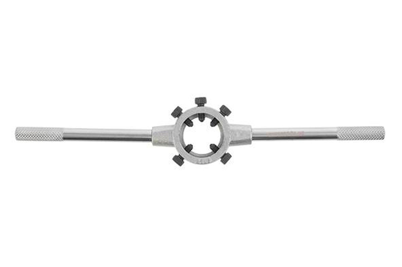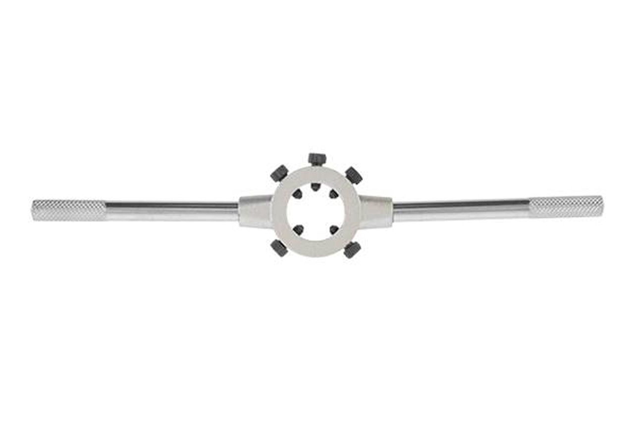 Утримувач призначений для фіксації плашок, розмірами М8 з наступним нарізуванням зовнішньої різьби. Тримач досить простої конструкції з хромованим покриттям. Розмір під плашку регулюється за допомогою гвинтів, вони також щільно фіксують плашку проти ковзання, що забезпечує точно нарізану різьбу, без перекосів. Ручки тримача з насічками для зручної роботи проти ковзання.