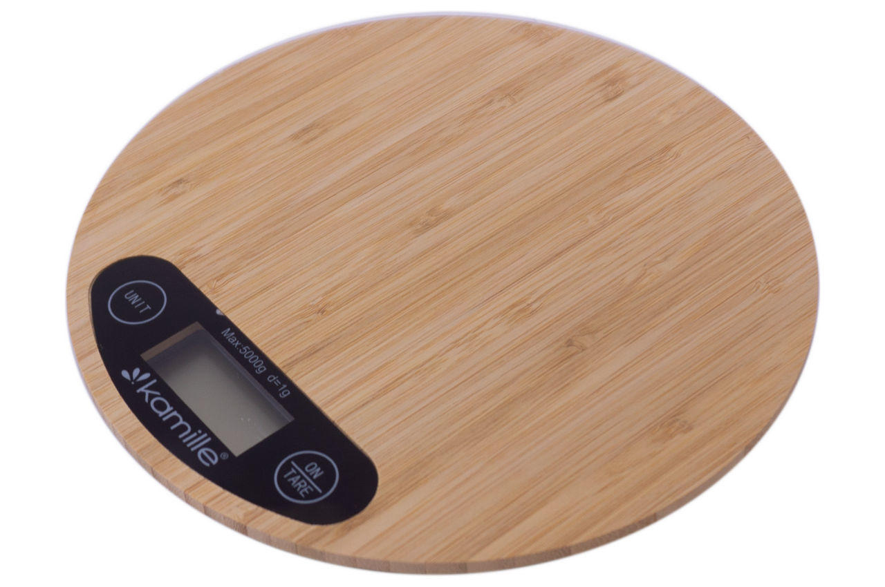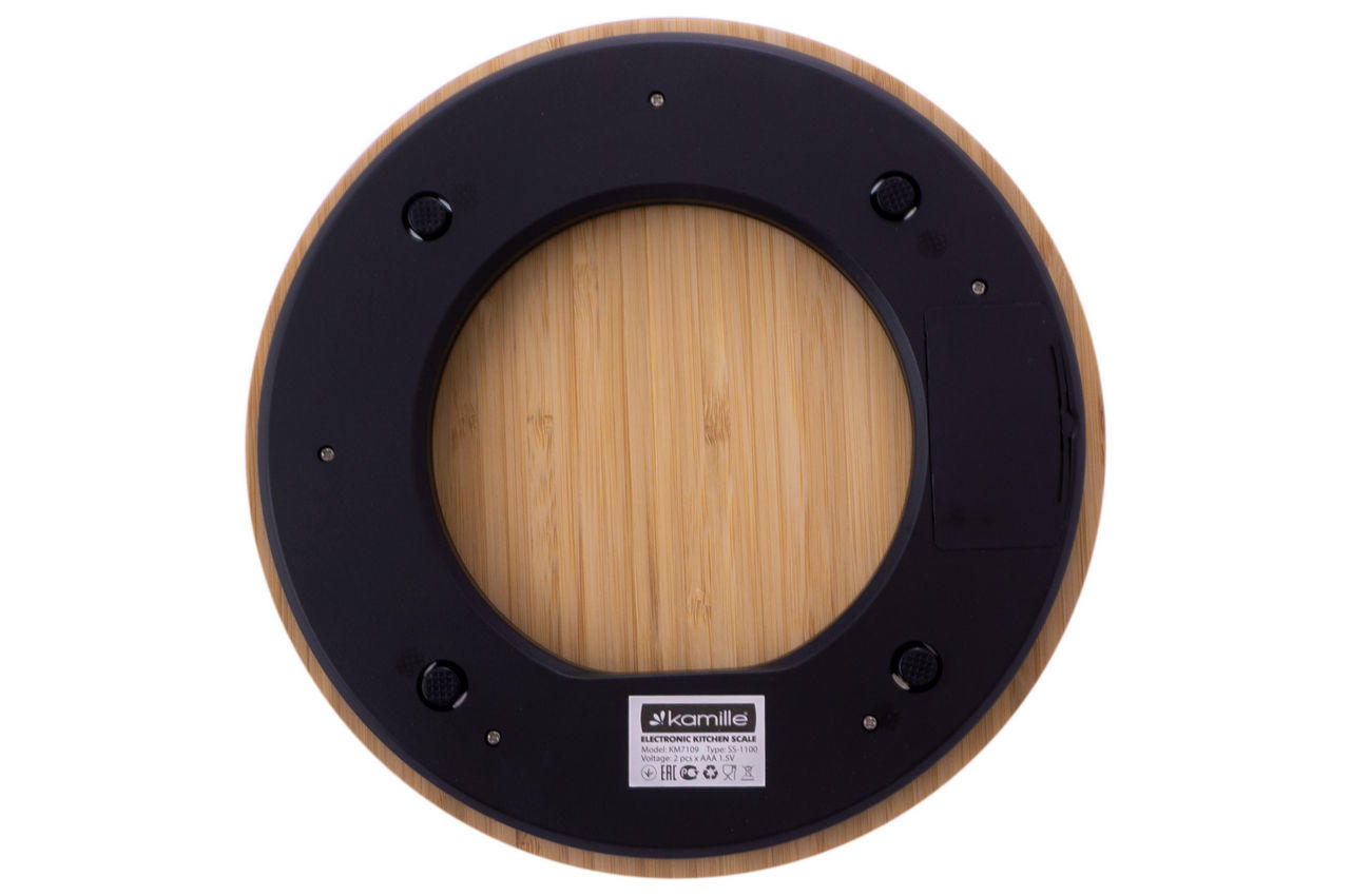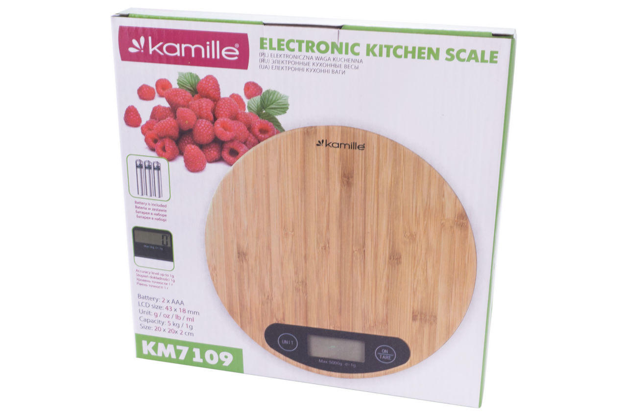Кухонні ваги - абсолютно незамінний аксесуар на кухні, потрібний у господарок побутовий прилад, який дозволяє спростити процес приготування страв. Точність зважування необхідна як дотримання рецептури страв у кулінарії, а й затребувана дієтології. У цьому випадку можливість дізнатися точну вагу продуктів дозволяє стежити за своєю фігурою та дотримуватися правил здорового харчування. Основні характеристики Kamille KM-7109: - Матеріал ваги: бамбук. - максимальне навантаження: 5 кг. - Батарейка у комплекті типу CR 2032. - Колір чорний - Габарити: 18,5 х18, 5х2 см. - LCD-дисплей, автоматичне вимкнення. - Індикація заряду батареї. - Індикація навантаження