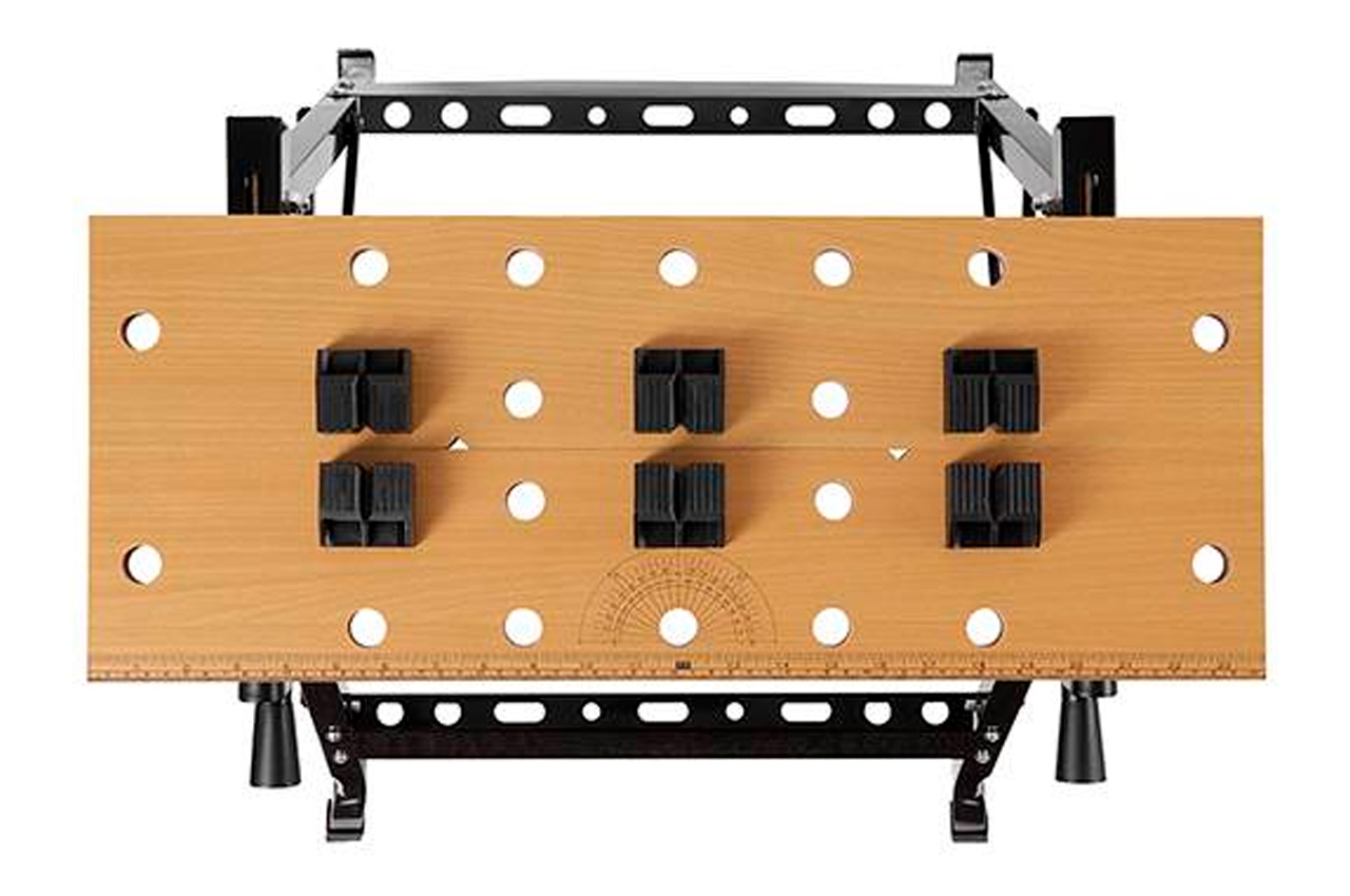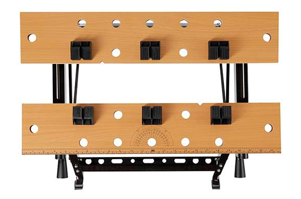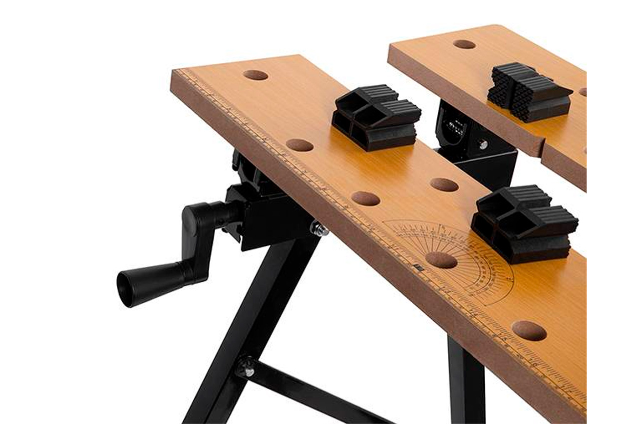 Складаний верстат-лещата застосовується під час виконання різноманітних робіт, для затискання деталей і заготовок та їх подальшої обробки. Завдяки своїй складаній конструкції може транспортуватися та використовуватись у будь-якому місці, на виїзді без прив'язки до робочого простору. Також не займає багато місця під час зберігання. Головна відмінність цього верстата від попередньої моделі (HT-6192) – наявність розсувних стільниць, які можуть змінювати кут нахилу 0-90°. Завдяки двом зручним ручкам лещата можна відкрити та зафіксувати необхідний предмет, шириною до 27 см. Отвори у стільниці, а також знімні пластикові упори служать для стискання та фіксації заготовок. Додатково верстат оснащений лінійкою та транспортиром для точних вимірювань у процесі роботи. У нижній частині конструкції передбачені дві паралельні планки з отворами для зберігання інструменту. Завдяки цьому все необхідне під рукою й не захаращує робочий простір. Виготовлений верстат з якісного сталевого профілю зі стільницею із ДСП, габаритами 605*240*790 мм, витримує рівномірне навантаження до 100 кг. За допомогою металевих розсувних планок верстат компактно складається для подальшого зберігання та транспортування.