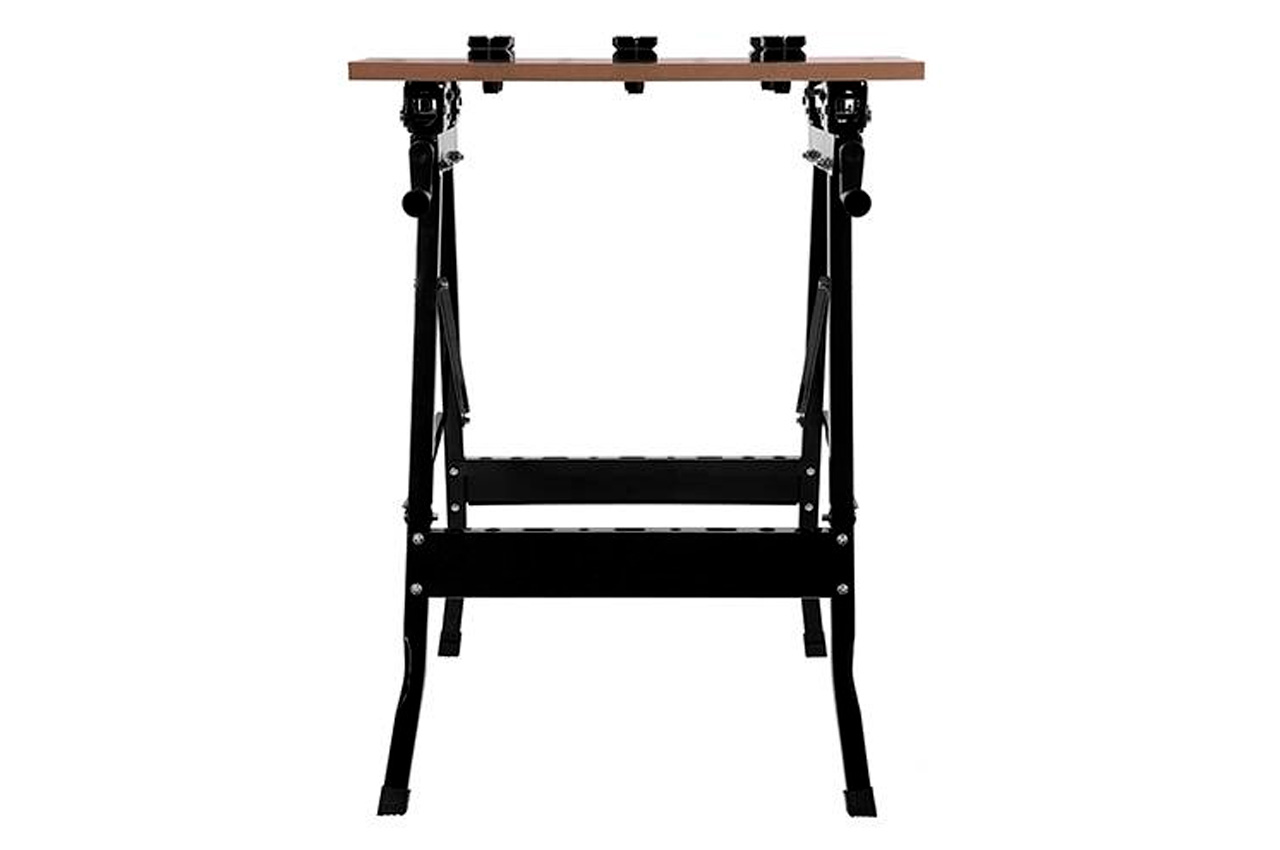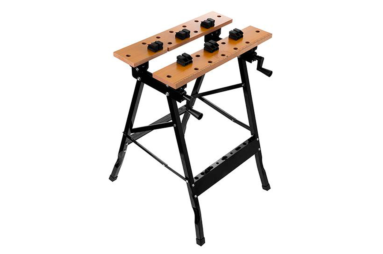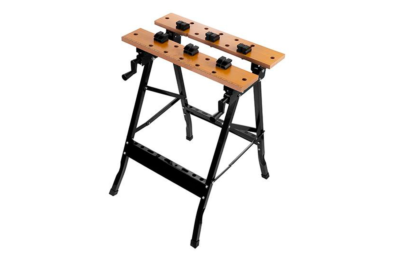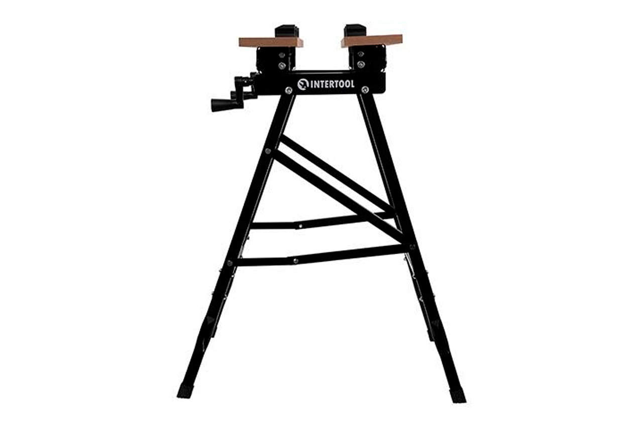 Складаний верстат-лещата застосовується під час виконання різноманітних робіт, для затискання деталей і заготовок та їх подальшої обробки. Завдяки своїй складаній конструкції може транспортуватися та використовуватись у будь-якому місці, на виїзді без прив'язки до робочого простору. Також не займає багато місця під час зберігання. Головна відмінність цього верстата від попередньої моделі (HT-6192) – наявність розсувних стільниць, які можуть змінювати кут нахилу 0-90°. Завдяки двом зручним ручкам лещата можна відкрити та зафіксувати необхідний предмет, шириною до 27 см. Отвори у стільниці, а також знімні пластикові упори служать для стискання та фіксації заготовок. Додатково верстат оснащений лінійкою та транспортиром для точних вимірювань у процесі роботи. У нижній частині конструкції передбачені дві паралельні планки з отворами для зберігання інструменту. Завдяки цьому все необхідне під рукою й не захаращує робочий простір. Виготовлений верстат з якісного сталевого профілю зі стільницею із ДСП, габаритами 605*240*790 мм, витримує рівномірне навантаження до 100 кг. За допомогою металевих розсувних планок верстат компактно складається для подальшого зберігання та транспортування.