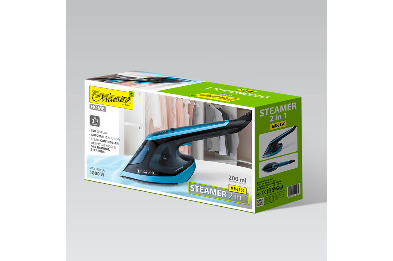 Праска-парогенератор 2 в 1 Maestro MR 315C потужністю 1800 Вт, з керамічною підошвою має два робочі режими: сухе прасування, відпарювання + додаткова функція: вертикальне відпарювання - дозволяє відпарювати речі у вертикальному положенні. Функціональність, дизайн та відповідність стандартам якості гарантують Вам надійність та зручність у використанні даного приладу.
