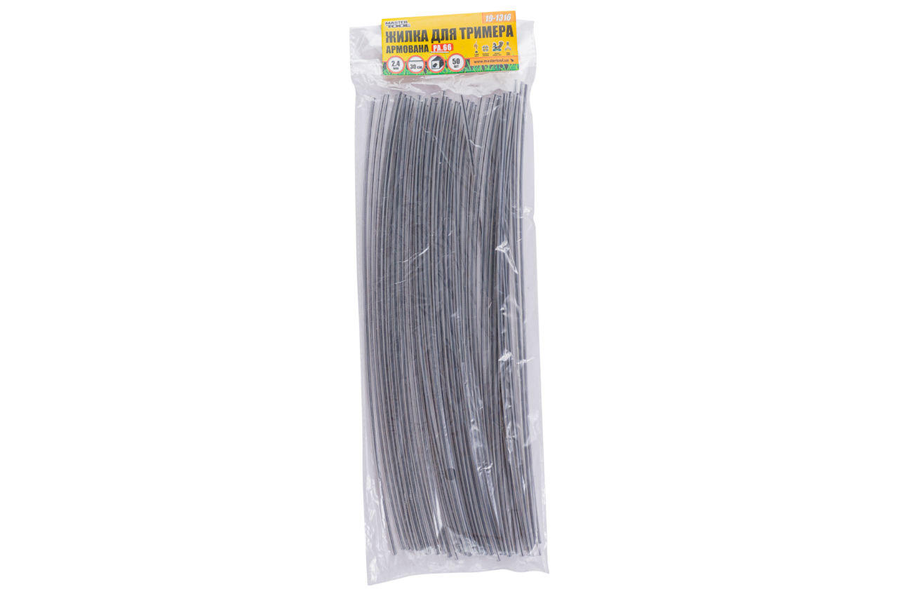 Волосінь для тріммера Mastertool - використовується в тримерах для скошування трави. Призначена для заправки в котушковий механізм триммеров. Довжина 0,3 м; Форма перетину: квадрат; Переріз 2,4 мм. Кількість 50 шт.
