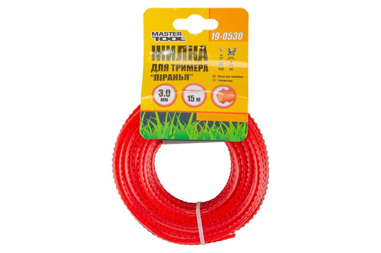 Волосінь для тріммера Mastertool - використовується в тримерах для скошування трави. Призначена для заправки в котушковий механізм триммеров. Довжина 15 м; Форма перетину: квадрат; Переріз 3,0 мм.