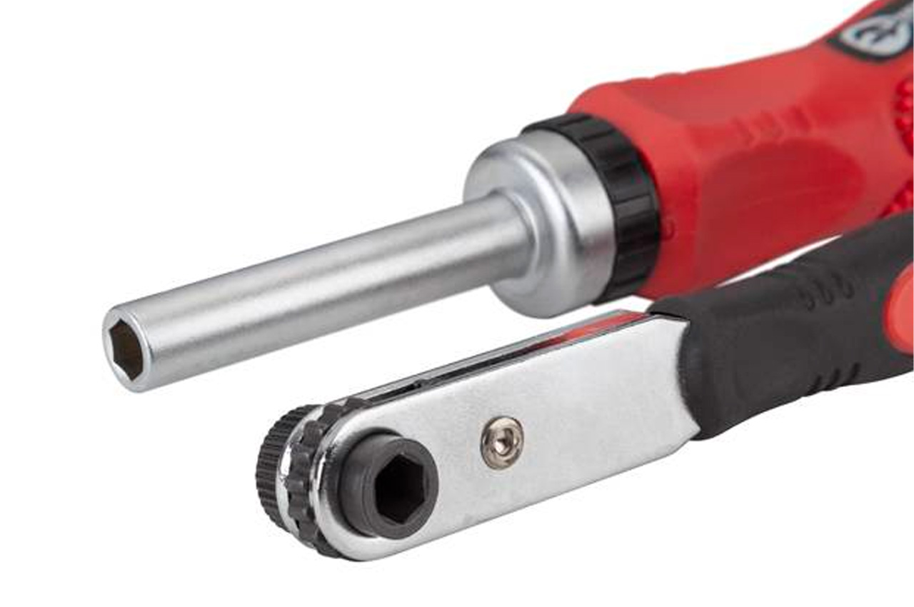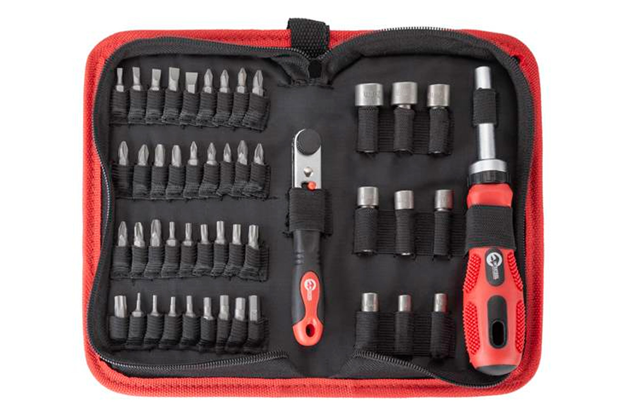 Викрутка реверсивна зі змінними бітами: SL3, SL4, SL5, SL6, SL7, PH0, PH1 - 2 шт., PH2 - 2 шт., PH3 - 2 шт., T10, T15, T20, T25, T27, T30, T40, PZ0, PZ1 - 2 шт., PZ2 - 3 шт., PZ3 - 2 шт., шестигранники (H) 1.5 мм, 2 мм, 2.5 мм, 3 мм, 4 мм, 5 мм, 5.5 мм, 6 мм і шестигранні головки : 4, 5, 6, 7, 8, 9, 10, 11, 12 мм; 3/16 ", 1/4", 5/16 ", 11/32", 3/8 ", 7/16", 1/2 ". Кількість насадок: 48 од.