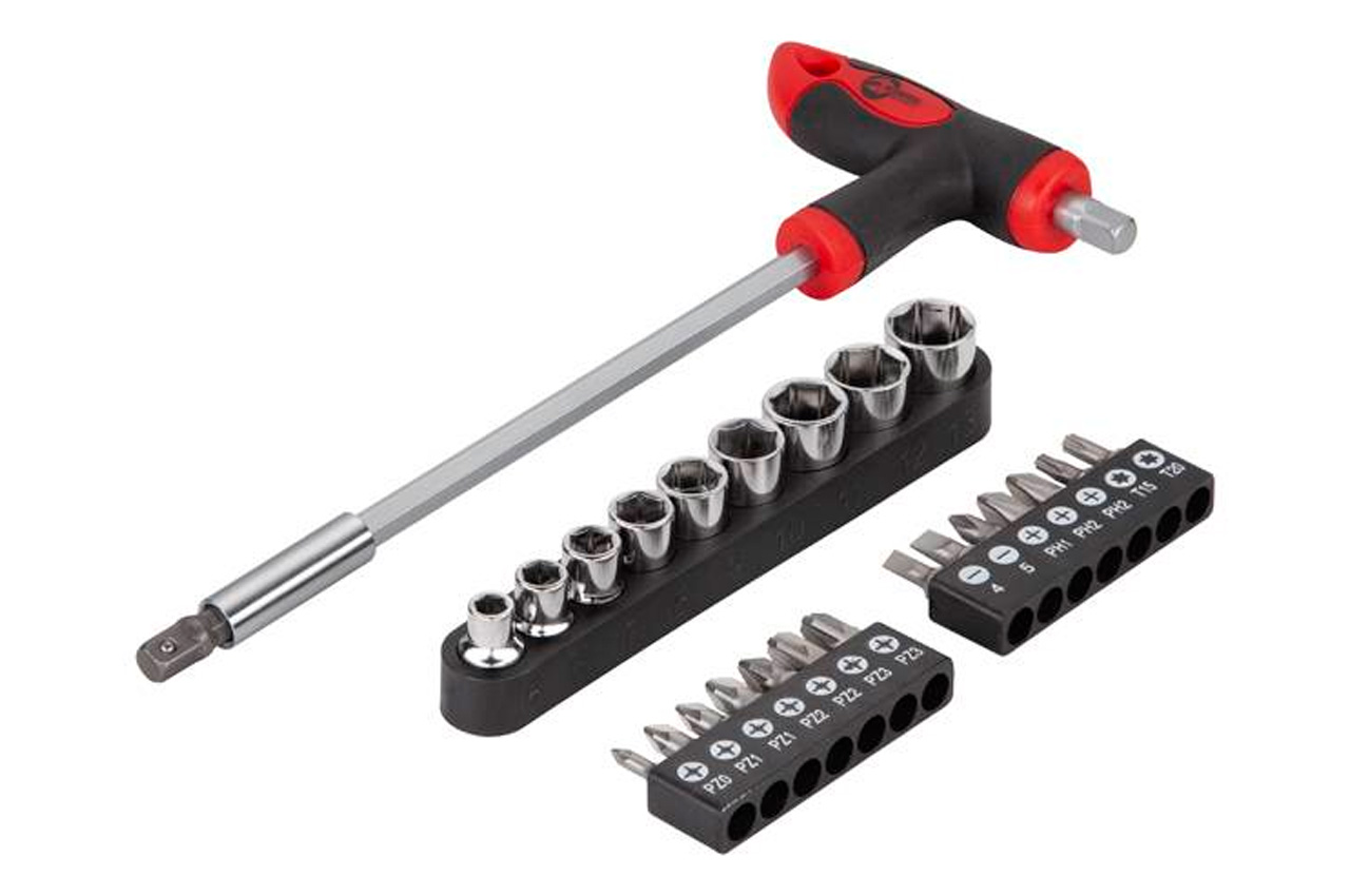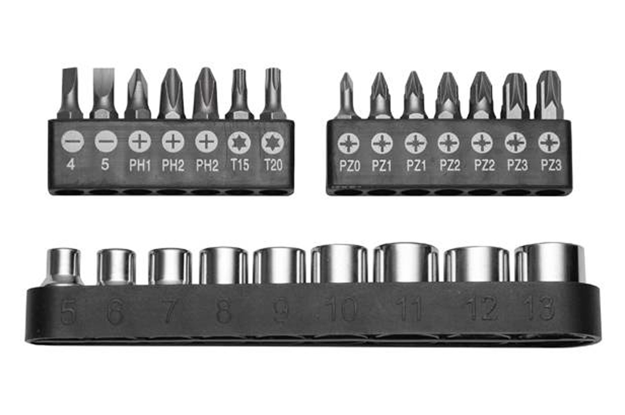 Викрутка реверсивна Т-подібна зі змінними бітами: SL4, SL5, PH1, PH2 - 2 шт., T15, T20, PZ0, PZ1 - 2 шт., PZ2 - 2 шт., PZ3 - 2 шт. і головки від 5 до 13 мм з кроком в 1 мм. Кількість насадок: 25 од.