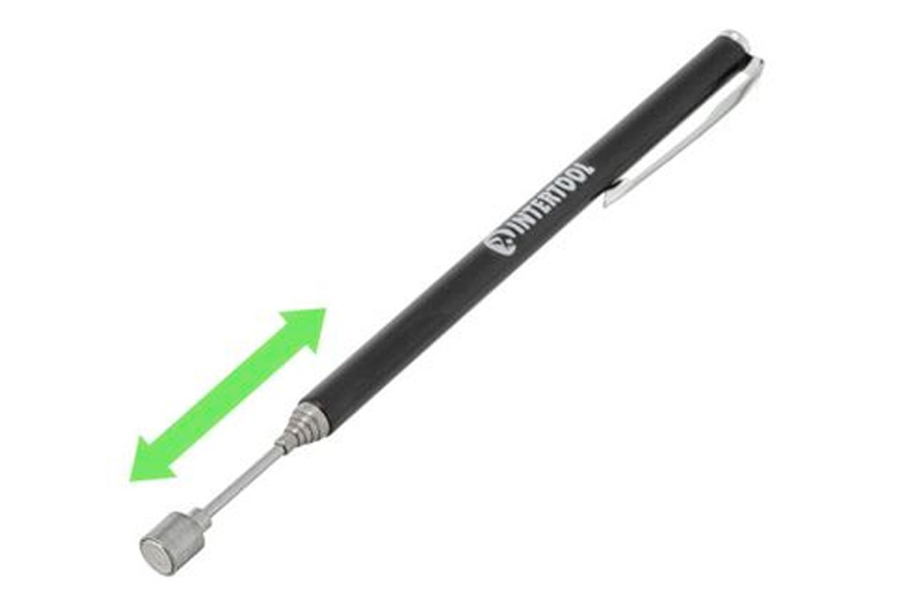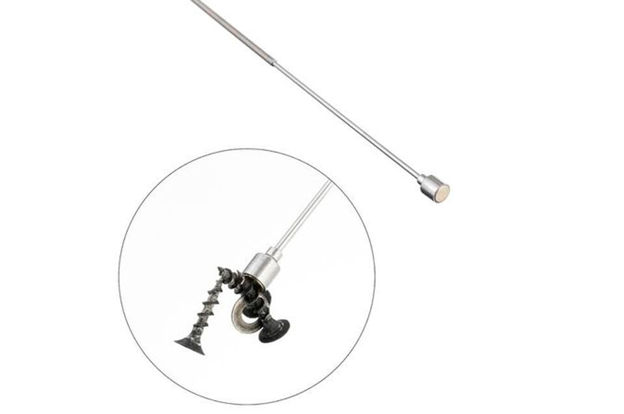 Магніт на телескопічному подовжувачі або як його ще називають захоплення магнітний телескопічний - корисна річ в автомайстерні і в гаражі будь-якого господаря. З його допомогою Ви легко знайдете і дістанете загубилися гайки, болти та інші металеві деталі, які потрапили всередину кузова і в місця, де їх здавалося б неможливо дістати! Портативний магніт легко розкладається з 127 мм в телескопічний довгий магнітний тримач довжиною 635 мм, і дозволяє дістати впали в важкодоступні місця металеві предмети з силою зчеплення 0,7 кг. Довжина в складеному вигляді: 127 мм; Зусилля затиску: 0,7 кг
