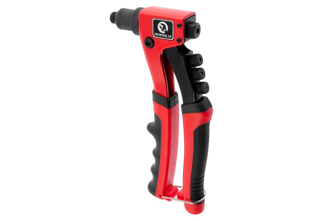 Ручний клепальний інструмент - заклепочник, призначений для скріплення будь-яких матеріалів з допомогою витяжних алюмінієвих заклепок різних діаметрів (2,4; 3,2; 4,0; 4,8 мм). Потужна сталева конструкція і надійний механізм значно збільшують ресурс роботи заклепочника. 4 знімні насадки дозволяють працювати з найбільш оптимальним розміром заклепок, при цьому не задіяти допоміжні ключі! Досить просто відкрутити / закрутити насадку. Ручки з гумовими накладками і упорами під пальці лежать в руці як влиті, що гарантує максимум зручності. Також на рукояті розташований запор для фіксації інструменту в неробочому стані. Особливості Довгі ручки забезпечують легку установку заклепок; Міцна сталева конструкція гарантує тривалий термін служби заклепочника; Насадки змінюються без ключа; Гумові вставки з заглибленнями для пальців на ручках забезпечать надійне захоплення руки під час роботи.