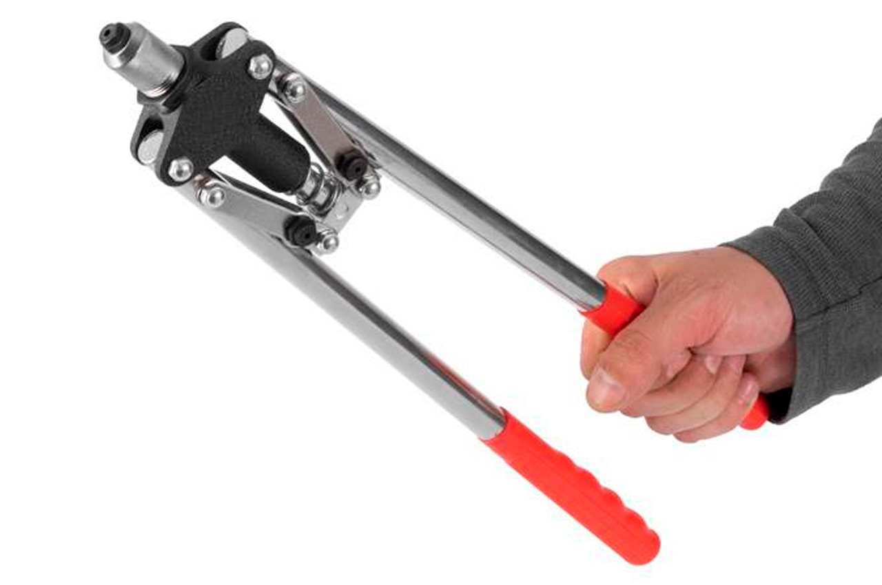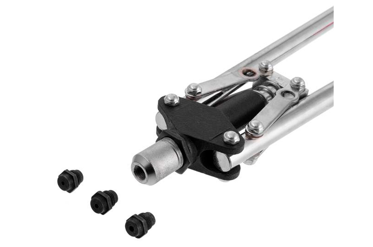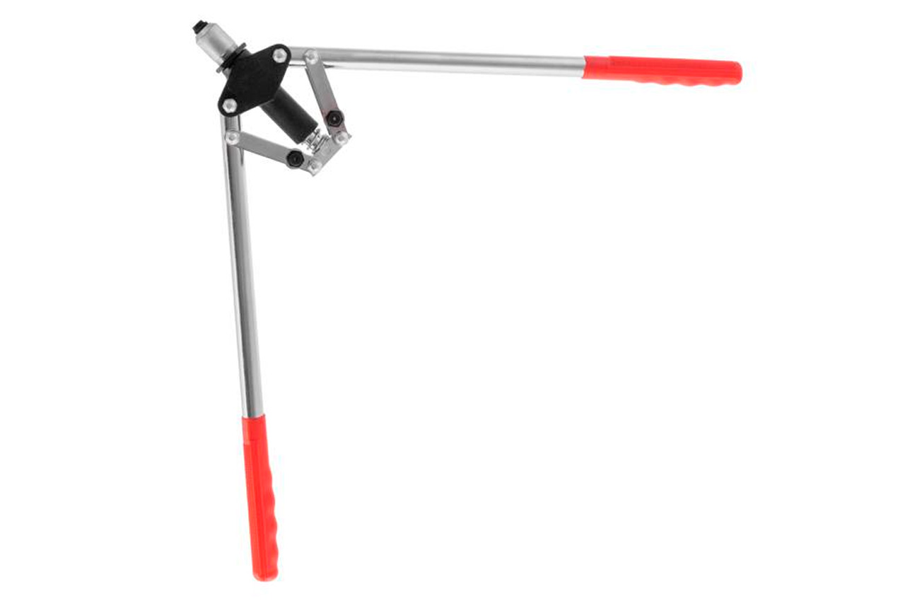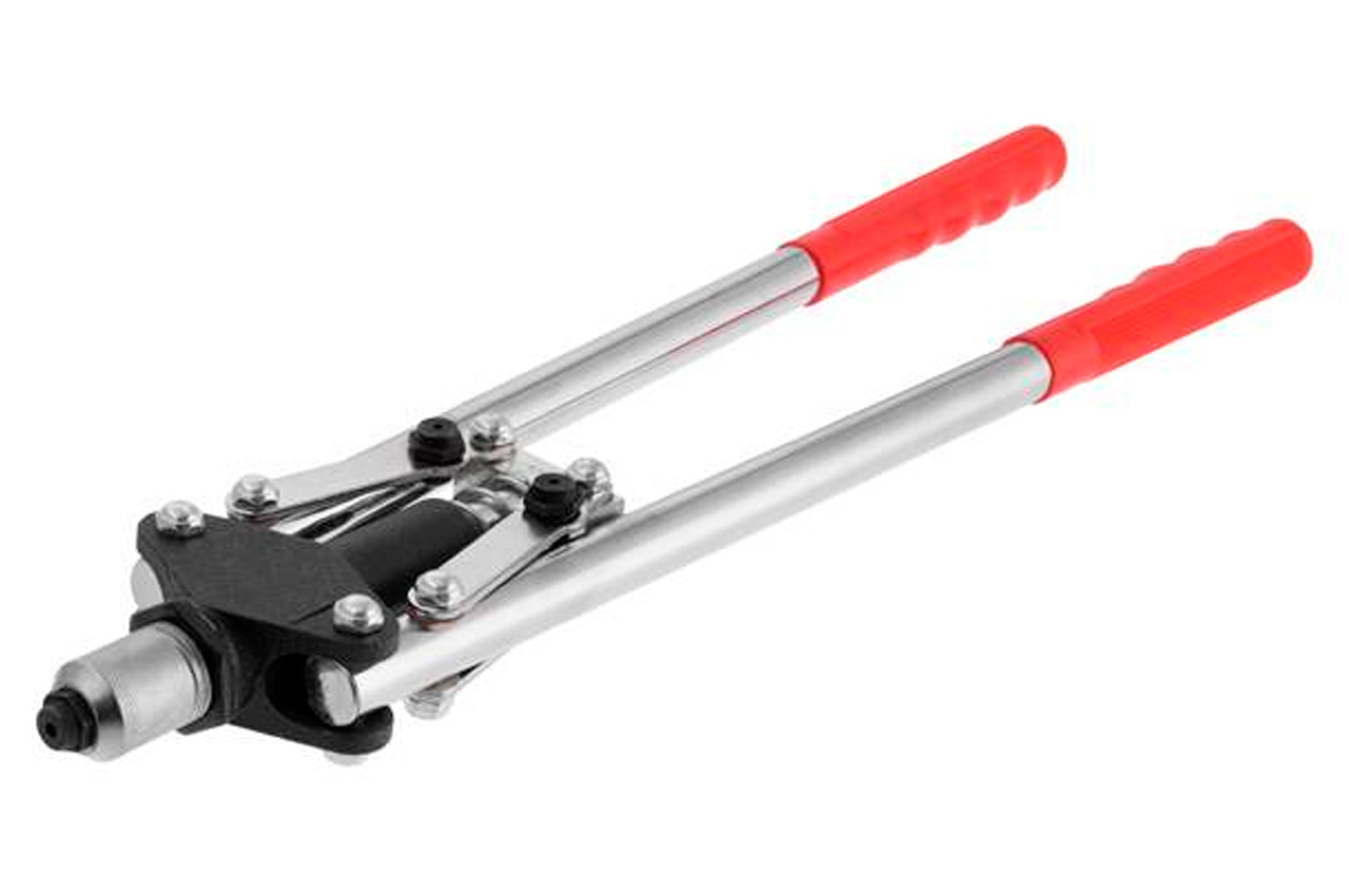Професійний інструмент, призначений для роботи з витяжними алюмінієвими і сталевими заклепками діаметром 3.2, 4 і 4.8 мм. Виготовлений з високоякісної сталі, має високу міцність і зносостійкість. Рукоятки інструменту довжиною 420 мм оснащені пластиковими наконечниками, що забезпечують надійне захоплення в руці. Діаметр заклепки: 3.2, 4, 4.8 мм
