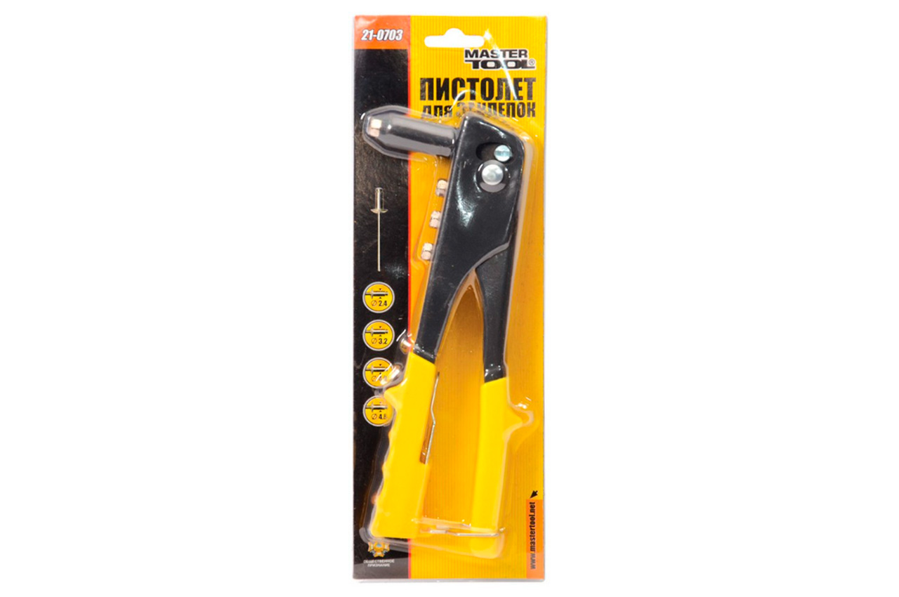 Заклепувальний пістолет, металевий, оснащений пластиковими рукоятками, укомплектований ключем. Використовується для заклепок діаметром 2.4, 3.2, 4.0 і 4.8 мм.