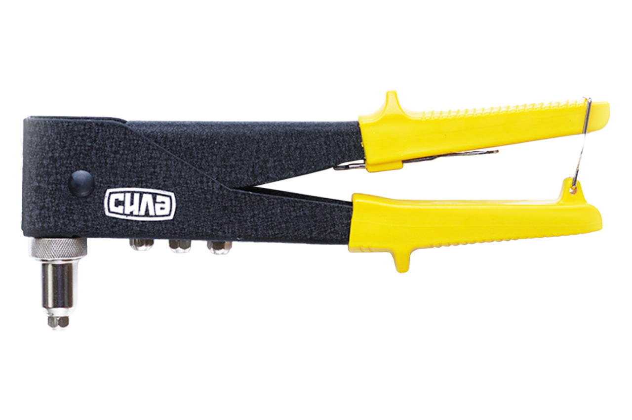 Механізм з трьома губками запобігає перекосу і заклинювання при установці заклепок. «Губки» з хромомолібденової стали мають високу міцність. Корпус зі сталі, покритий спеціальною фарбою з високою стійкістю до корозії і механічних пошкоджень. Додатково: контейнер для збору стрижнів; Матеріал / покриття губок: хром-ванадієва сталь; Матеріал / покриття корпусу: інструментальна сталь; Матеріал / покриття рукоятки: хром-молібденова сталь; Насадки для заклепок: 2,4 мм; 3,2мм; 4,0мм; 4,8 мм