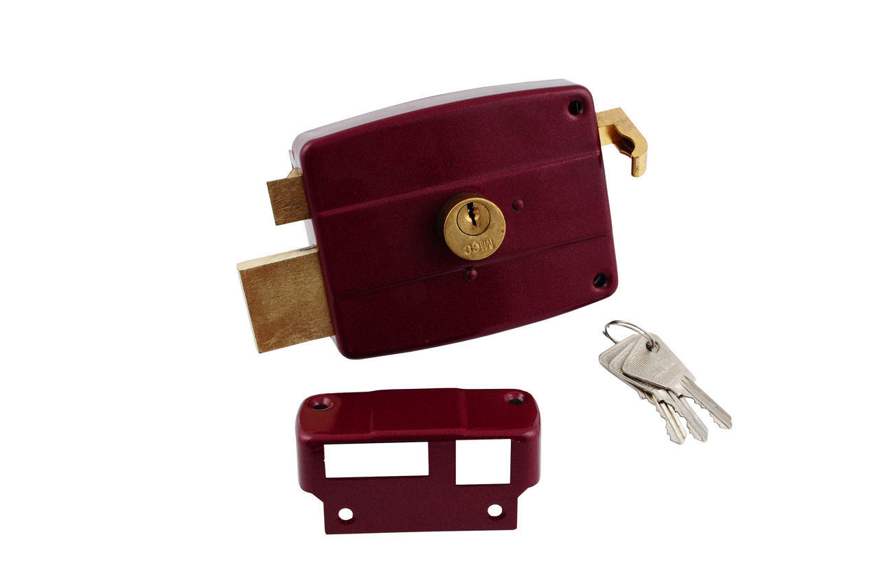 Замок накладний з одним прямокутним штирем засува, має механізм автоматичного замикання і запобіжник. Призначений для замикання дверей товщиною 35- 45 мм. Модель універсальна і підходить для замикання як правою, так і лівою двері.