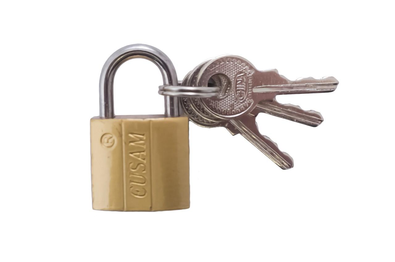 Замок навісний FZB має металеву дужку і литий корпус шириною 20 мм, виготовлений з металу з антикорозійним покриттям жовтого кольору, на корпусі є декоративне тиснення. У комплекті з замком три лазерних ключа.