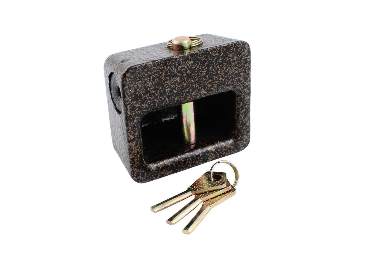 Замок виготовлений зі сталі покритий антикорозійним покриттям, має литий корпус шириною 90 мм. При використанні корпус повністю закриває петлі, що значно підвищує захисну функцію замка. У комплекті з замком три ключа.