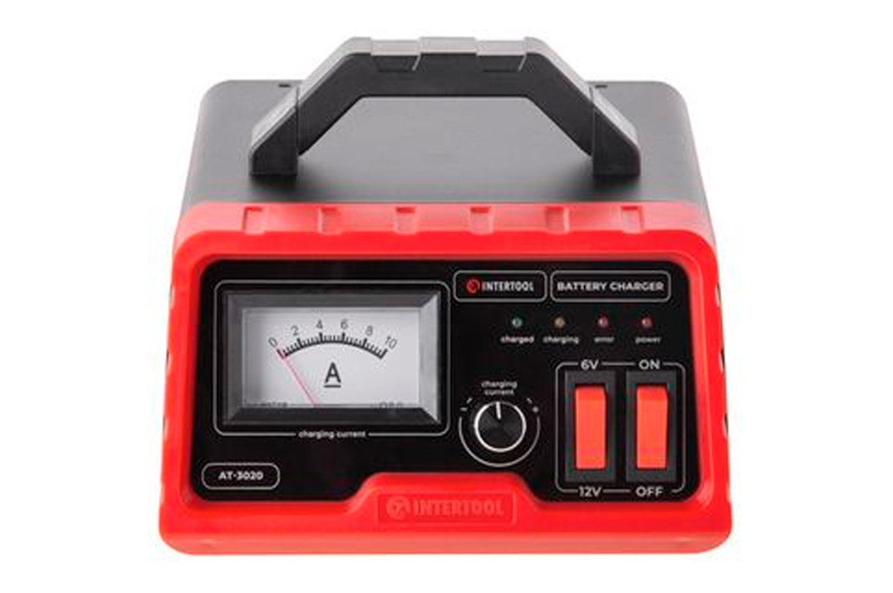 Зарядний пристрій AT-3020 заряджає всі типи батарей: 6В і 12В, а також підходить для акумуляторів катерів, газонокосарок, гідроциклів, сільськогосподарської техніки, промислового і побутового обладнання. Електронний захист від перевантаження, короткого замикання і невірного підключення (зворотна полярність) вбережуть Ваш акумулятор і зарядку від пошкоджень і поломок. Зарядний пристрій має повністю ізольовані клеми і амперметр, для зручного регулювання сили струму. На корпусі зарядного пристрою є зручна ручка для транспортування. Особливості: Захист від КЗ; <br> Захист від неправильного підключення; <br> Захист від перегріву ;; Напруга: 6/12 В; Потужність: 110 Вт; Напруга живлення: 230 В; Постійний вихідний струм: 0-10 А; Ємність акумулятора: до 100 Ач