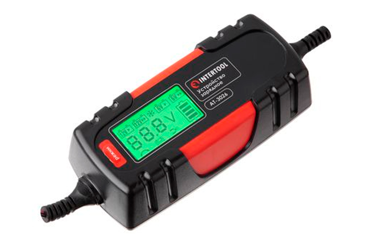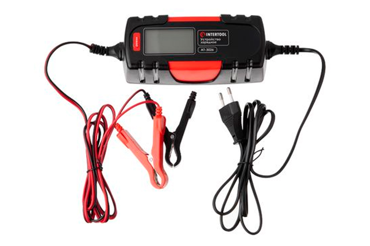 Зарядний пристрій INTERTOOL AT-3026 - інтелектуальний, керується мікропроцесором та системою з багатоступеневим циклом заряджання. Пристрій підходить для всіх типів батарей: 6 В мотоциклів, 12 В автомобілів, а також для акумуляторів катерів, газонокосарок, гідроциклів, сільськогосподарської техніки, промислового та побутового обладнання. Зарядний пристрій має повністю ізольовані клеми та вбудований кронштейн для настінного монтажу. LCD дисплей показує напругу батареї та процес заряджання. Не вимагає вашої участі в процесі заряджання, повністю автоматична.