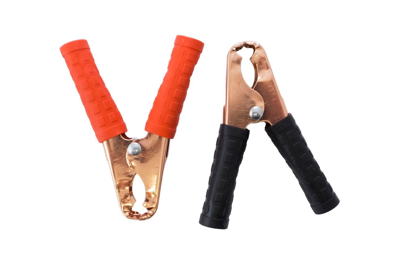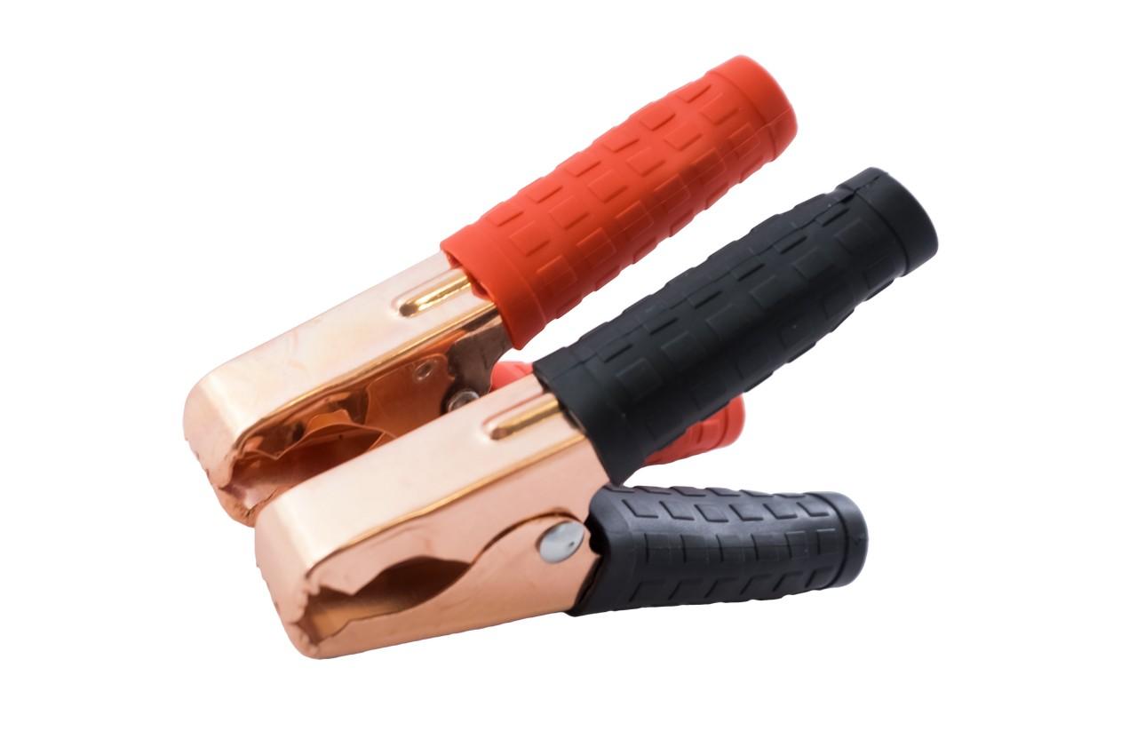У наборі 2 затиску. Затискачі для клем акумулятора виготовлені з алюмінію зверху покритого міддю, довжина - 11 см, відстань між ручками - 9 см, обгумовані ручки червоного і чорного кольору. Красния підключається до позитивної клеми АКБ, а чорний - до негативної.