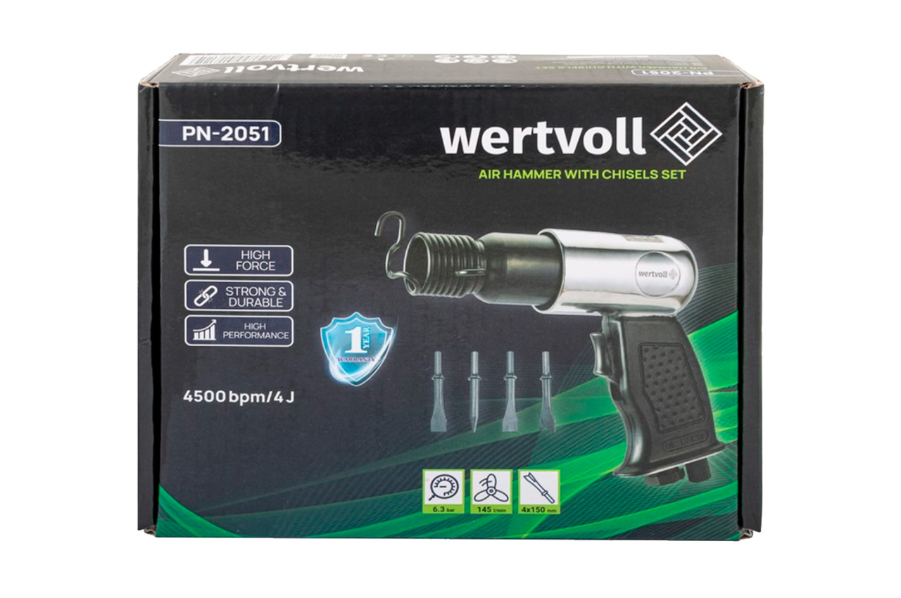 Зубило пневматичне Vertwoll - з його допомогою демонтують різні запчастини кузовів автомобілів, знімають шари штукатурки і старі облицювальні плити. • регулятор швидкості • загартований сталевий ствол і поршень • циліндричний хвостовик • легкий і міцний алюмінієвий корпус • TPR накладка зменшує вібрації • перехідник на швидкознімне з’єднання 1/4’’ • 4 насадки в комплекті • рубка тонколистового металу, зрив точкового зварювання, зрізання заклепок, виконання ударних робіт