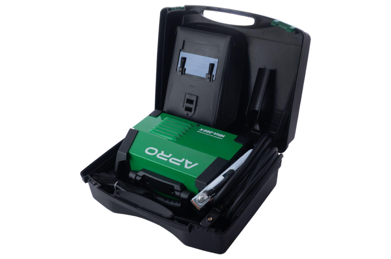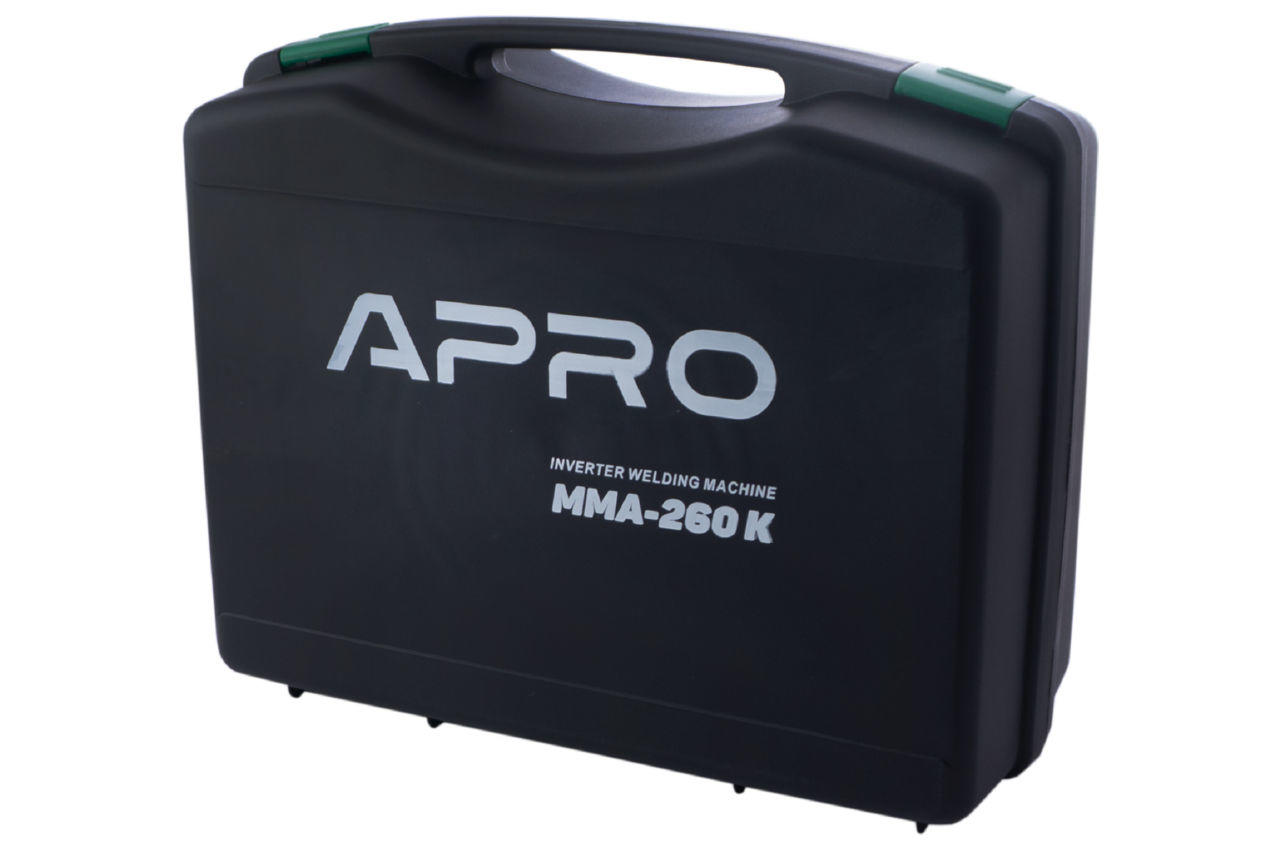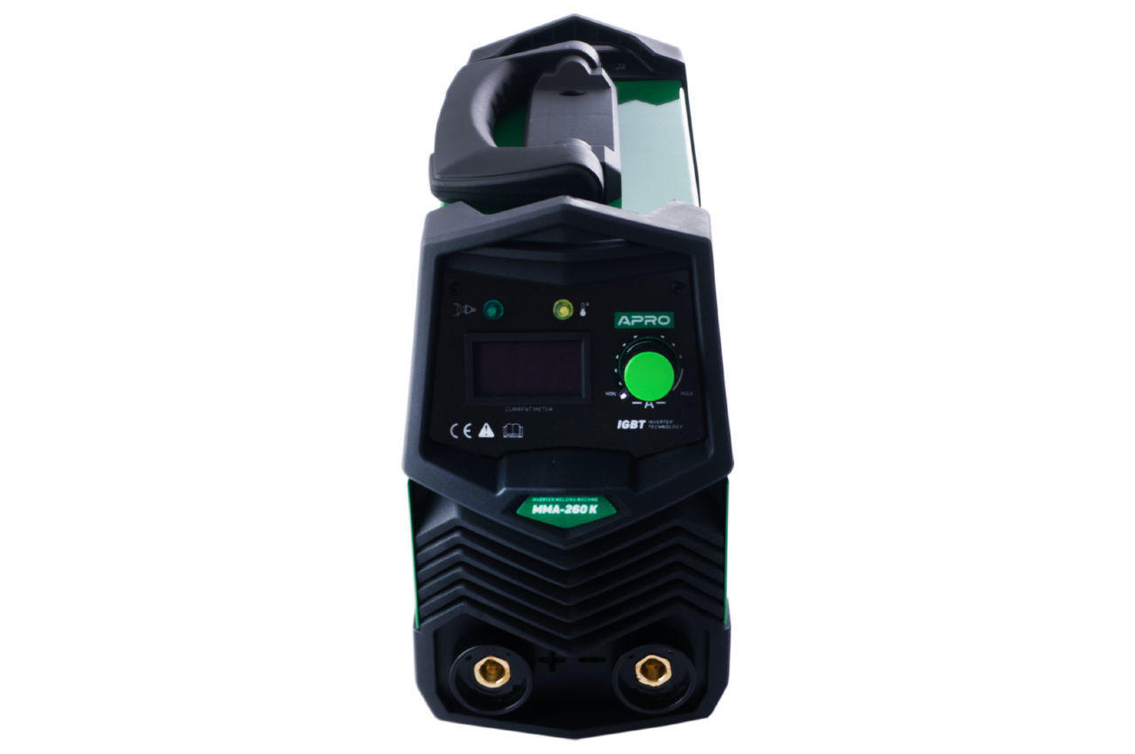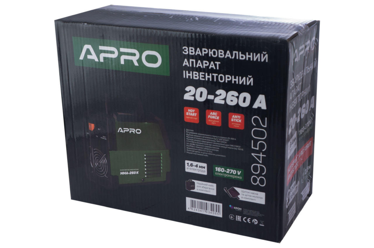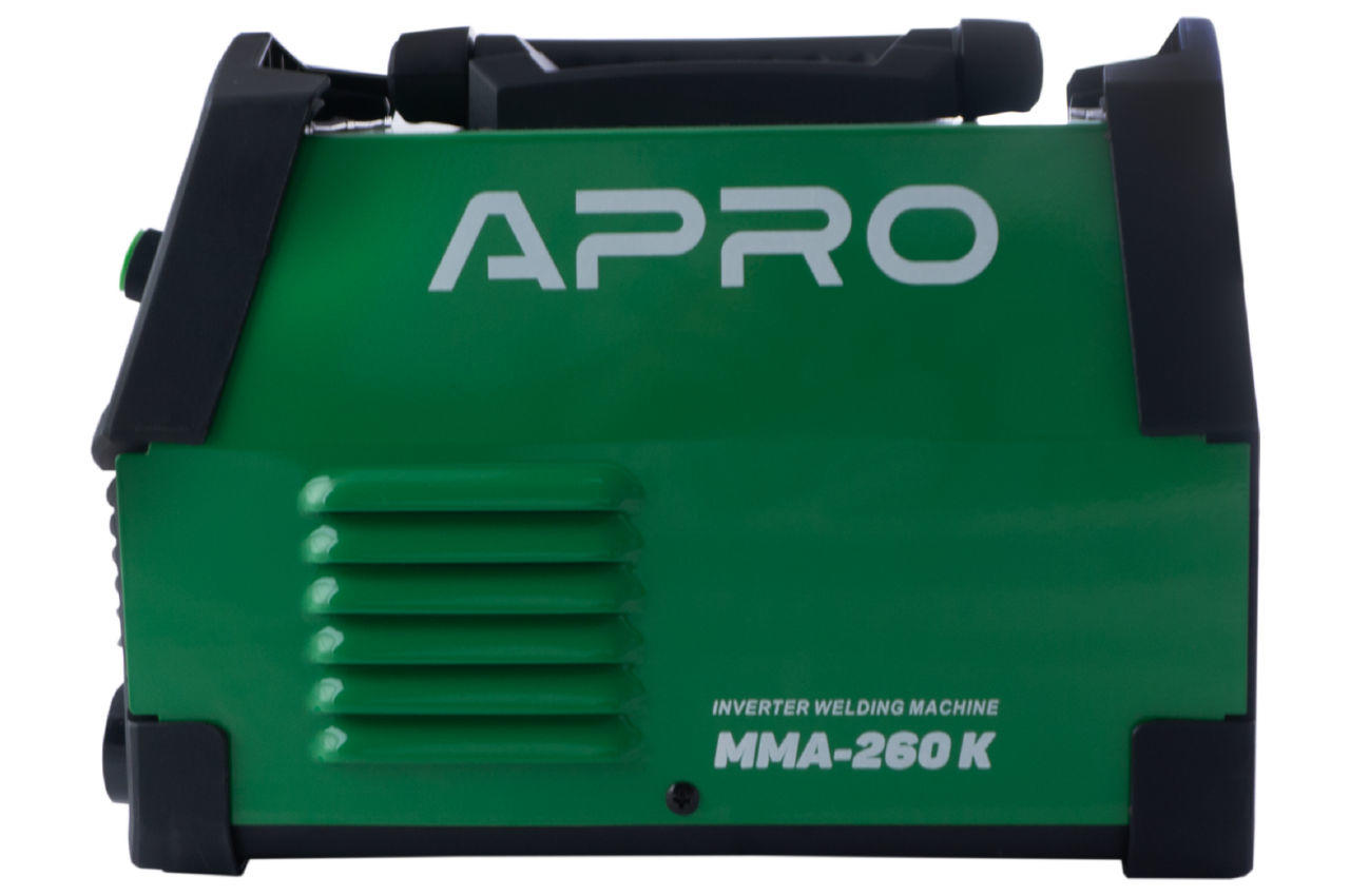 Зварювальний апарат інверторний Apro MMA-260K дозволяє виконувати як побутові, так і професійні завдання. Дозволяє використовувати електрод діаметром 1,6-4 мм. Коефіцієнт корисної дії інструменту складає 90%, працює в діапазоні зварювального струму від 20 до 260 А. Мінімальна напруга мережі під навантаженням складає 180 В. За функціонал відповідають: - HotStart — забезпечує швидке підпалювання дуги; - АntiStick — виключає можливість залипання електрода; - ArcForce — утримує та посилює дугу у випадку її розриву; функція захисту від підвищеної напруги в мережі. Зварювальний апарат при максимальному струмі зварювання працює 6 хвилин без перерви, а 4 хвилини потрібно дати апарату охолодитися. Термодатчики всередині апарату контролюють температуру й при перегріванні вимикають апарат, що гарантує вашому апарату довгий срок служби.